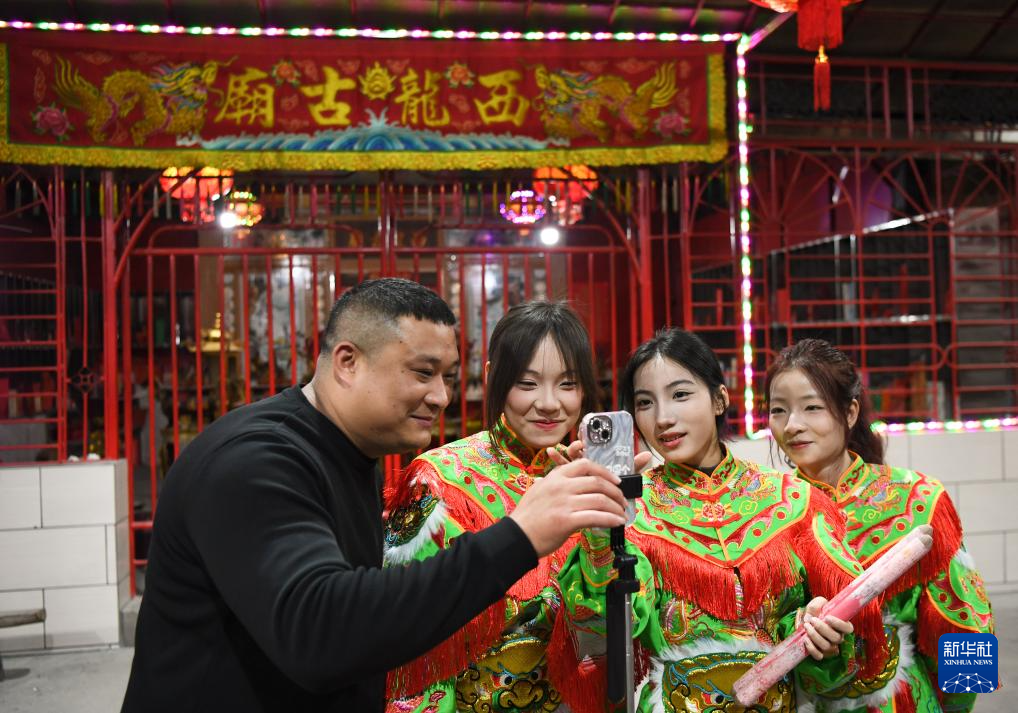 1月20日,在廣東汕頭潮陽區的西龍古廟,英歌教練陳坍鵬(左一)和隊員觀看網絡直播平臺。