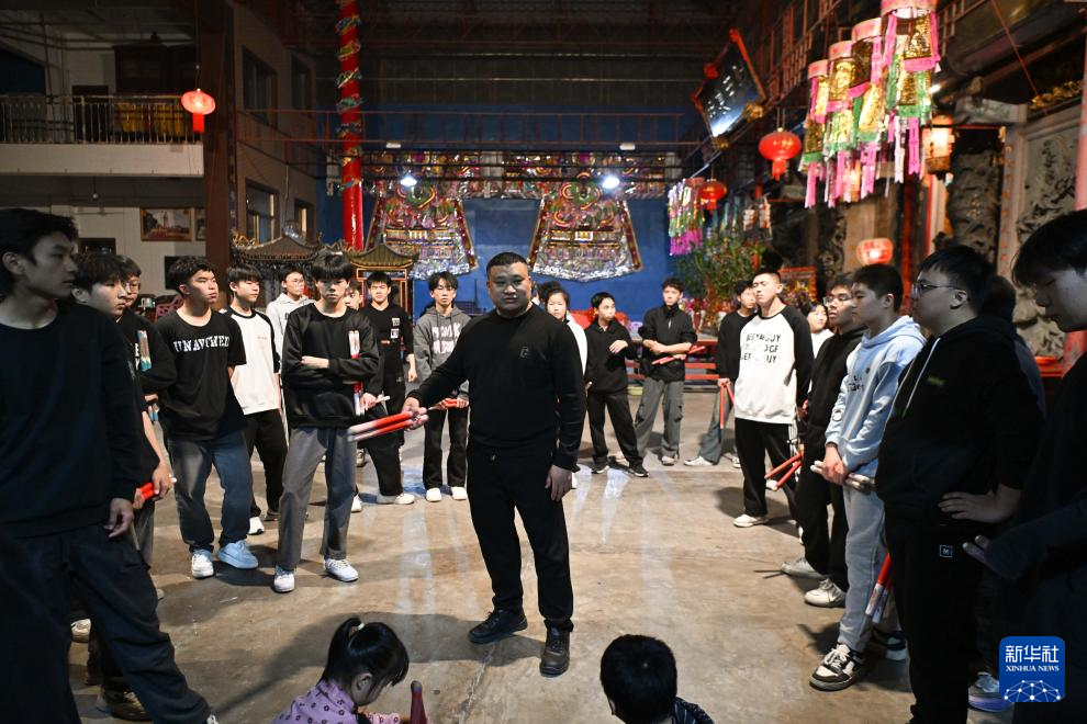 1月21日,在廣東汕頭潮陽區的塔館雙忠祠,英歌教練陳坍鵬(中)在指導隊員。