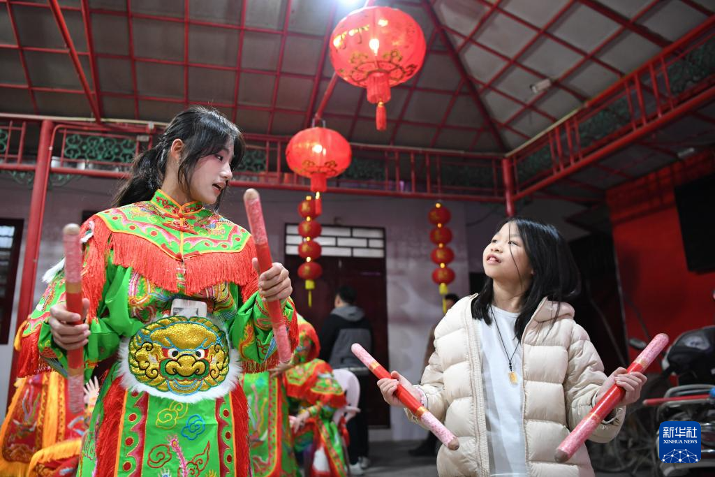 1月20日,在廣東汕頭潮陽區的西龍古廟,西門女子英歌隊隊員在指導小朋友領會英歌動作要領。