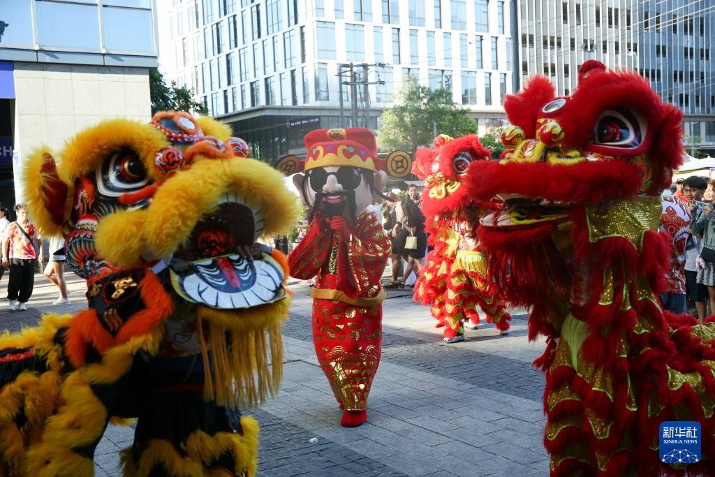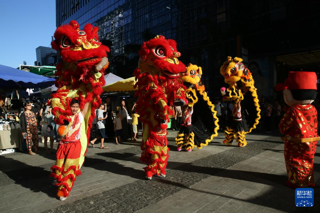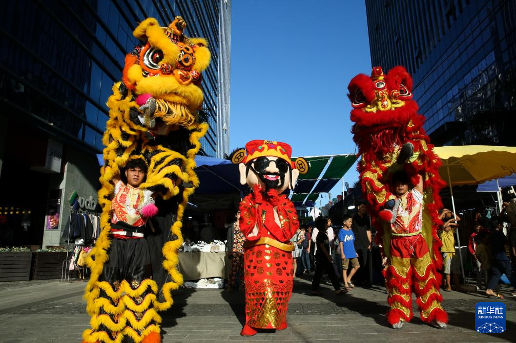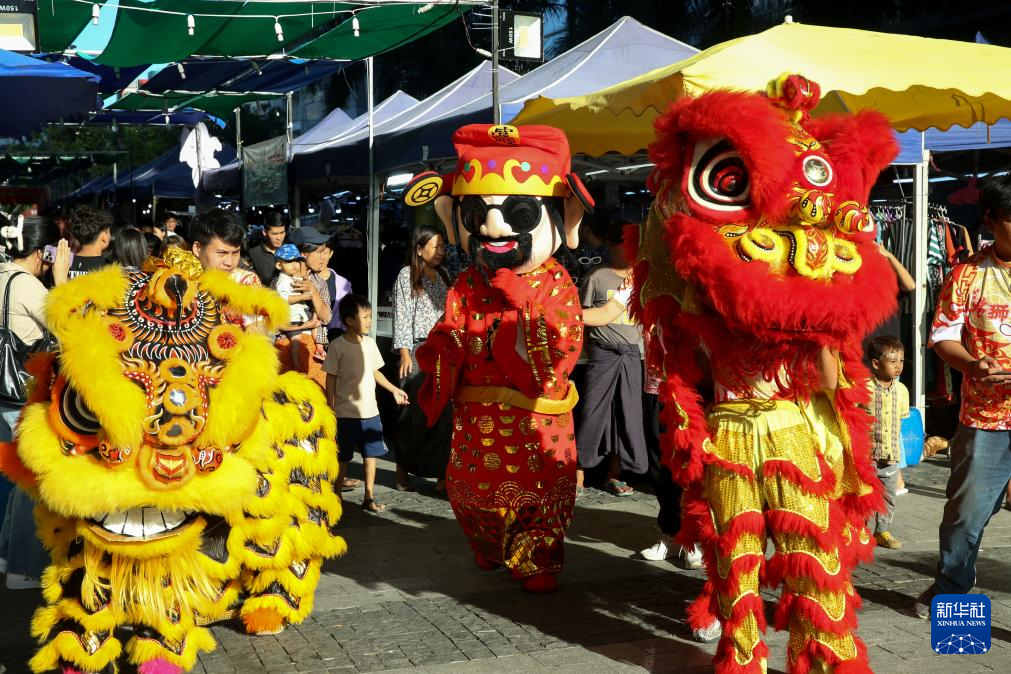 這是1月18日在緬甸仰光的一處市集拍攝的為迎接中國農歷春節舉辦的舞獅表演。
