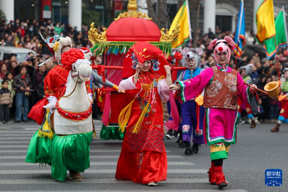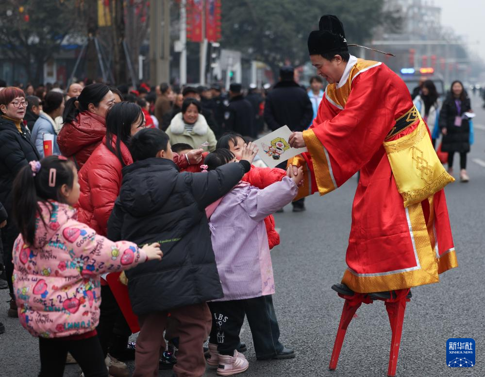 1月22日,在綿竹年畫節開幕式上,踩著高蹺的演員與群眾互動。