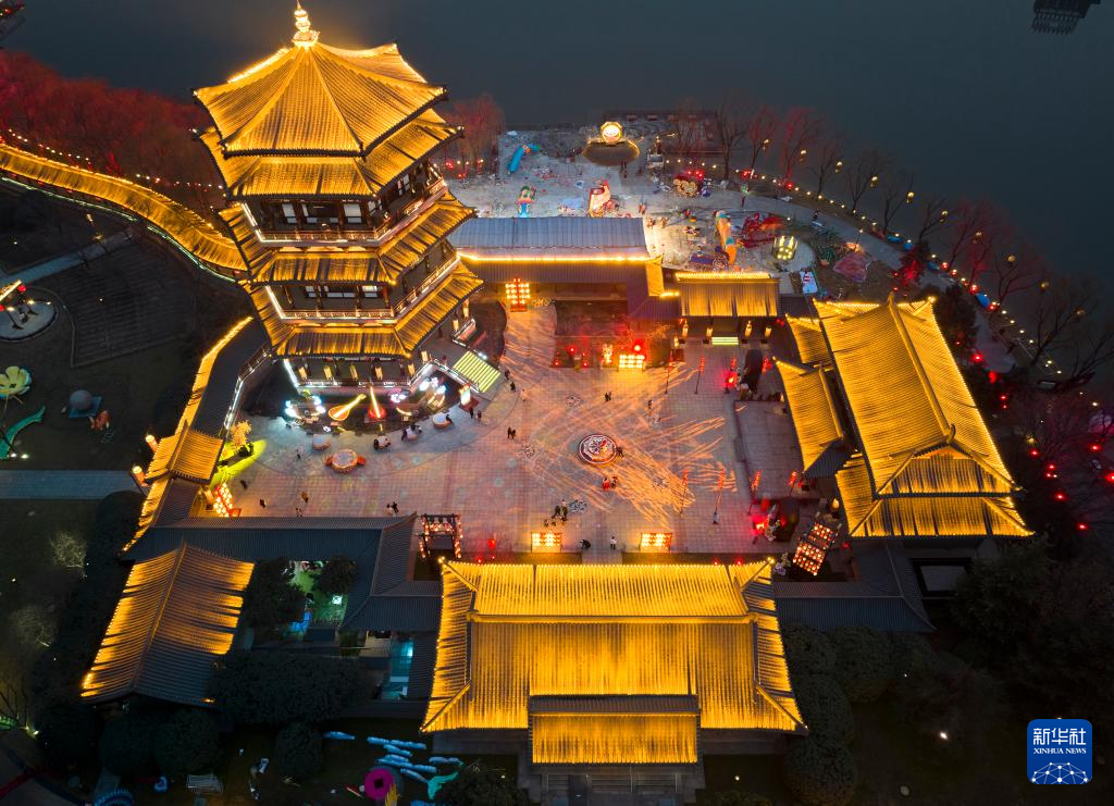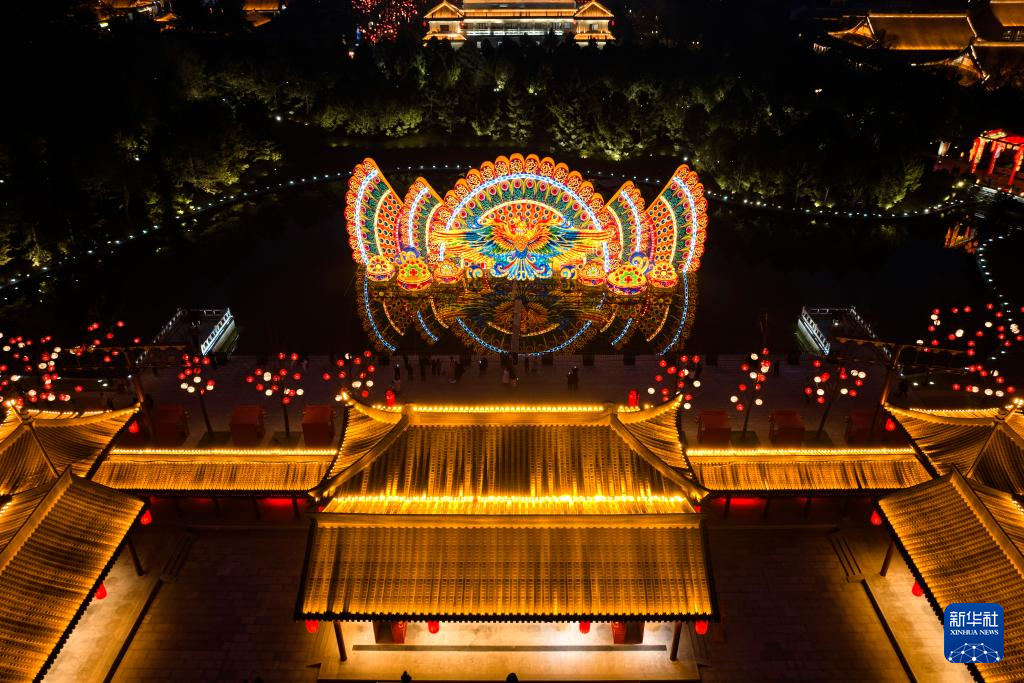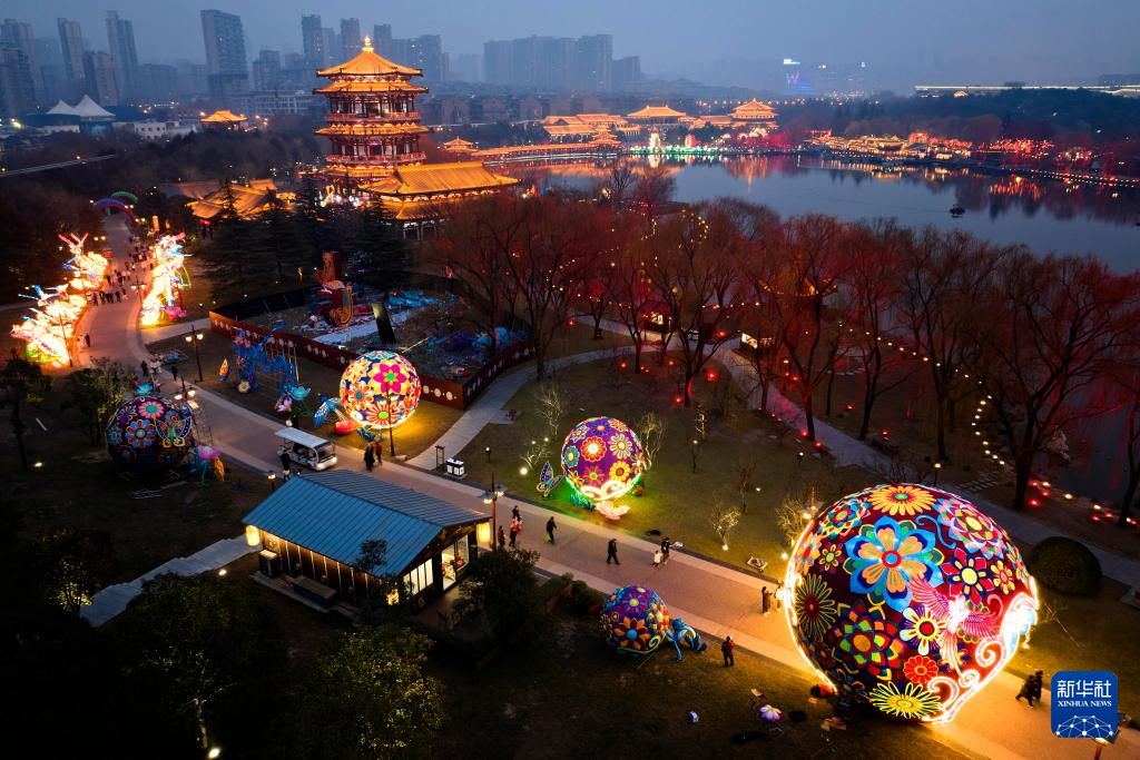 1月22日晚拍攝的西安大唐芙蓉園內的巨型彩燈(無人機照片)。