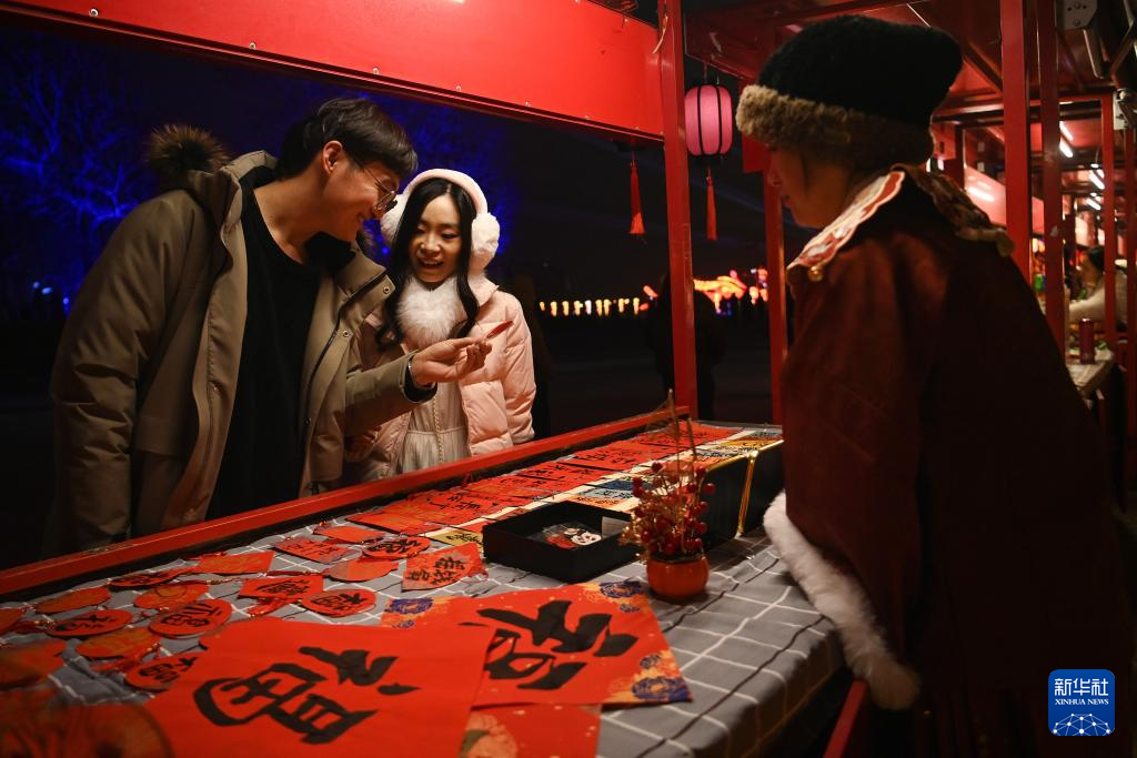 1月22日晚,游客在西安大明宮國家遺址公園燈會上逛國潮集市。