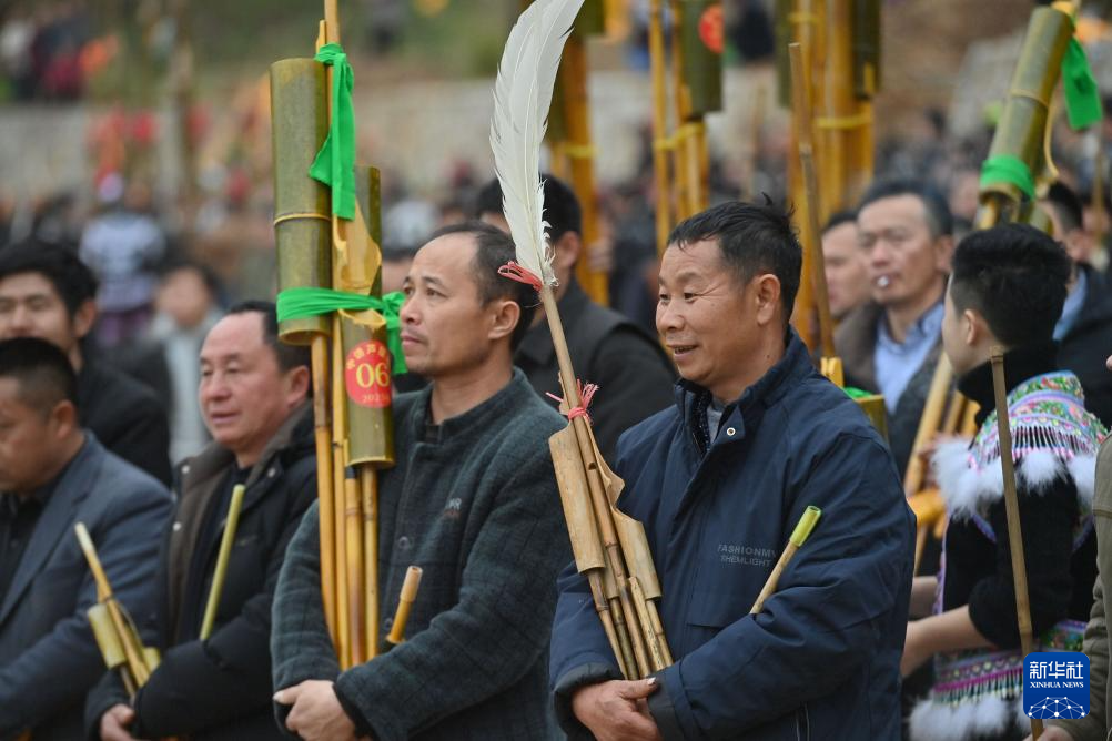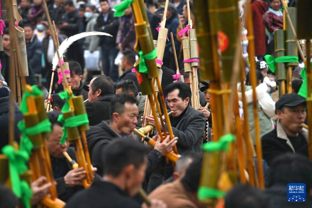 2月5日,人們在融水苗族自治縣桿洞鄉百鳥衣蘆笙坡會上吹蘆笙。