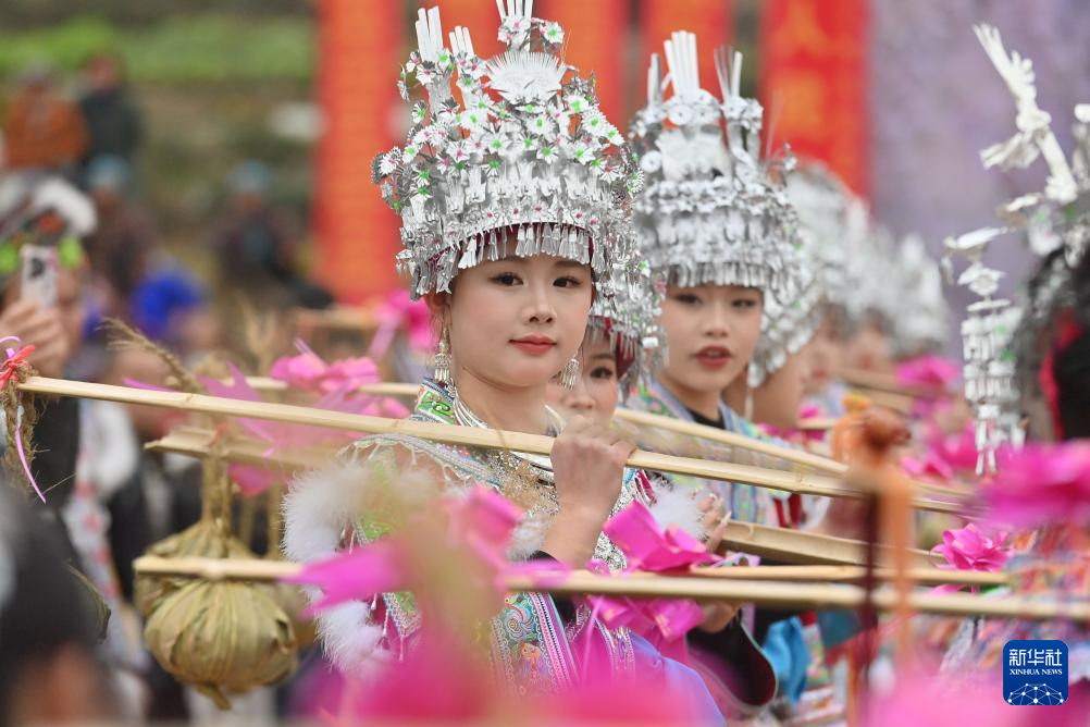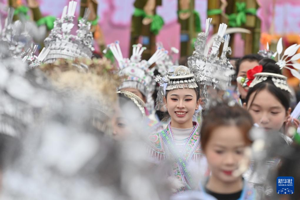 2月5日,苗族姑娘在融水苗族自治縣桿洞鄉百鳥衣蘆笙坡會上進行民俗展演。