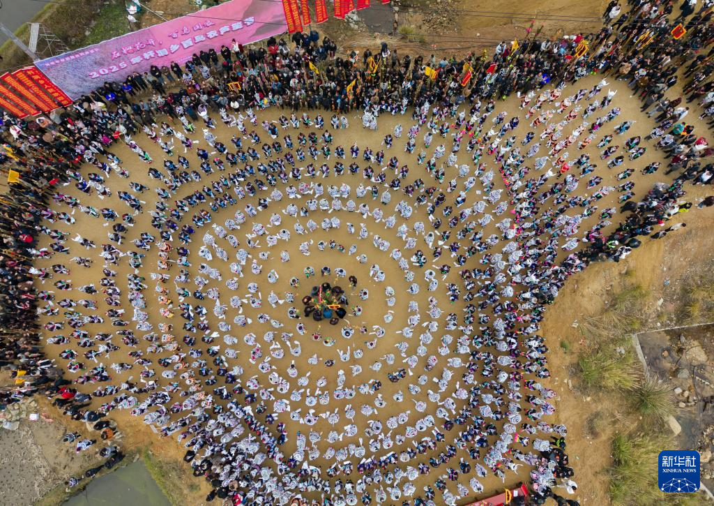 2月5日,在廣西融水苗族自治縣桿洞鄉百鳥衣蘆笙坡會上,各族群眾一起跳蘆笙踩堂舞(無人機照片)。