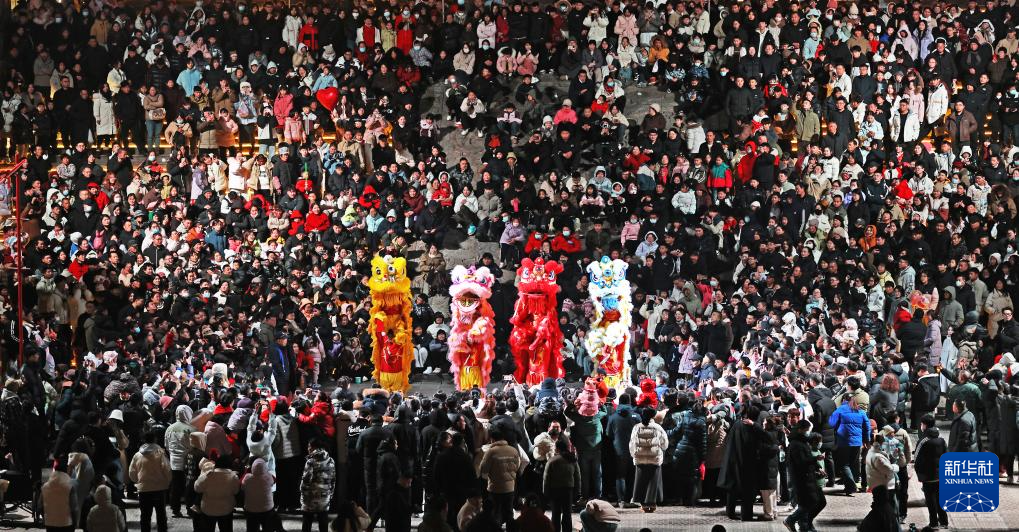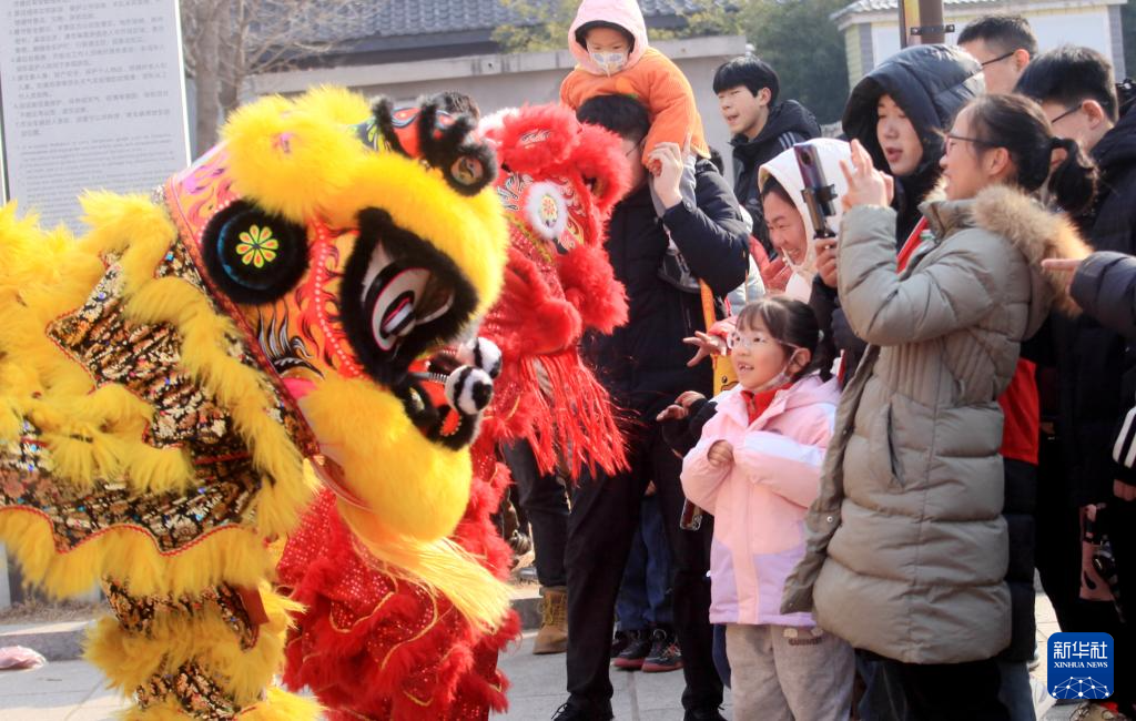 1月29日,游客在山東省臨沂市郯城縣郯國古城景區觀看舞獅表演。