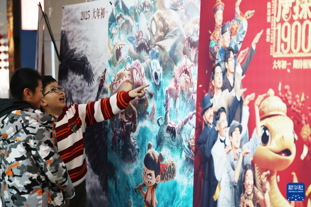 2月4日,在山東省臨沂市郯城縣一家影城,等待觀影的觀眾在觀看電影海報。