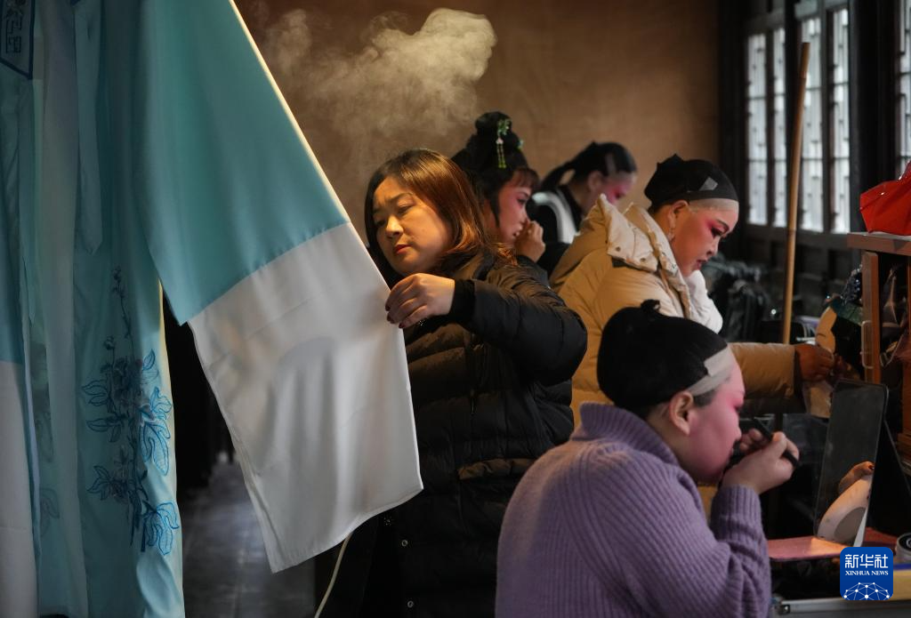 在紹興市柯橋區夏履鎮蓮增村,民間越劇團晶蕾藝術團的演員在為表演越劇《五女拜壽》做準備(1月25日攝)。