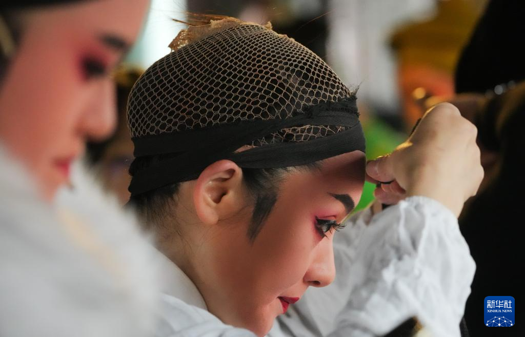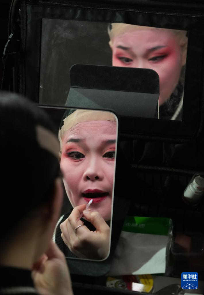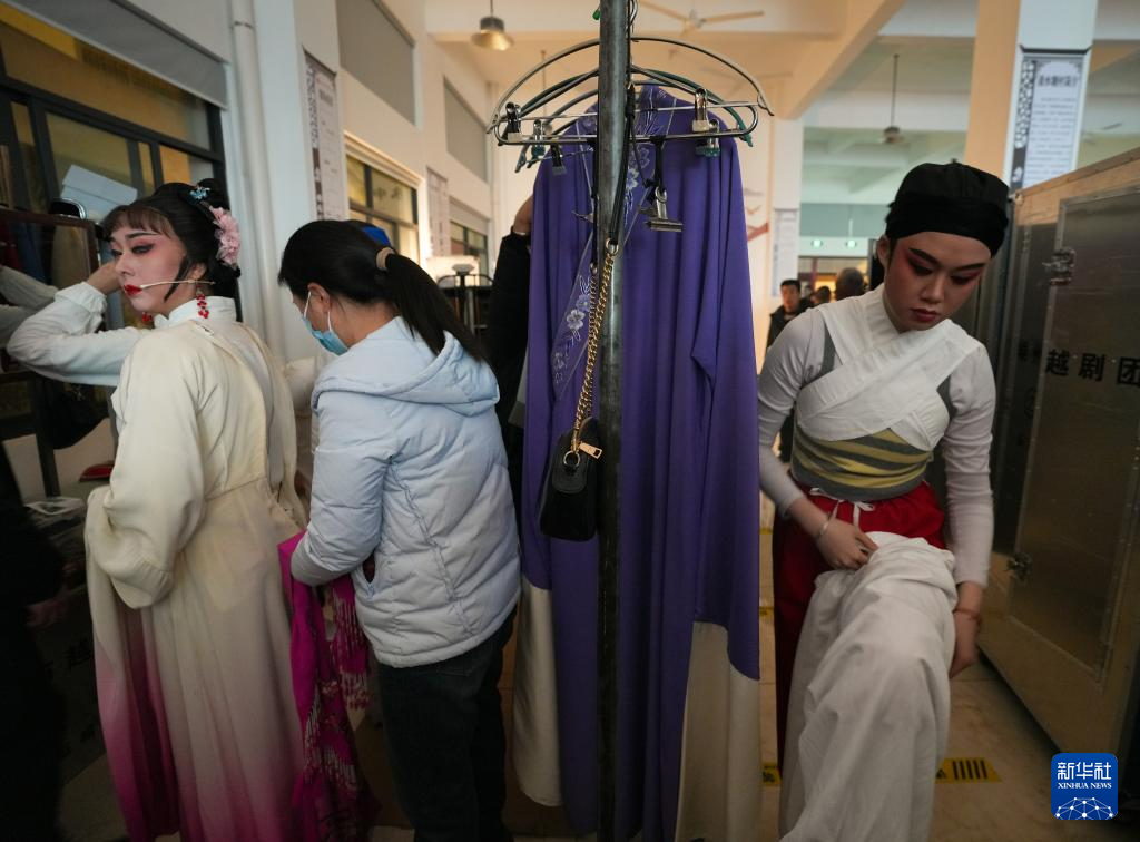 在浙江紹興嵊州市三界鎮清水塘村文化禮堂,下鄉演出的嵊州市越劇團演員在臨時隔出的區域補妝、更衣(1月21日攝)。