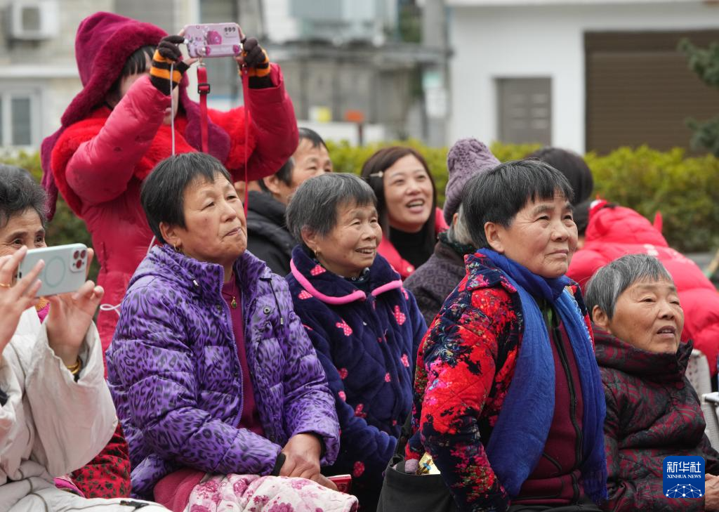 紹興市柯橋區夏履鎮蓮增村村民在村口的戲臺前觀看民間越劇團晶蕾藝術團表演的越劇《五女拜壽》(1月25日攝)。