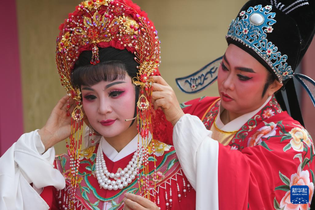 在紹興市嵊州市三江街道橋里村舉行的戲劇村晚中,上東潭村村民、越劇愛好者袁軍燕(后)和搭檔陳月萍在表演越劇《孔雀東南飛》選段前做準備(1月21日攝)。