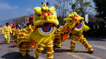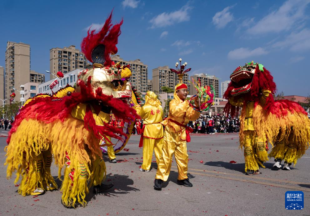 2月6日,人們在南澗縣龍燈會上表演舞獅。
