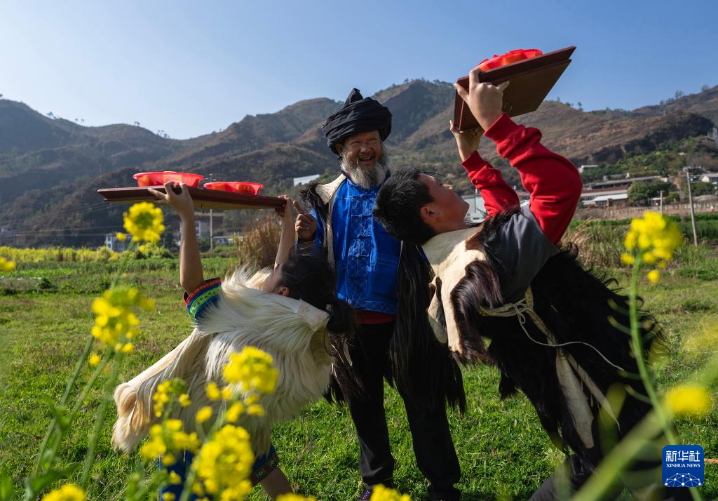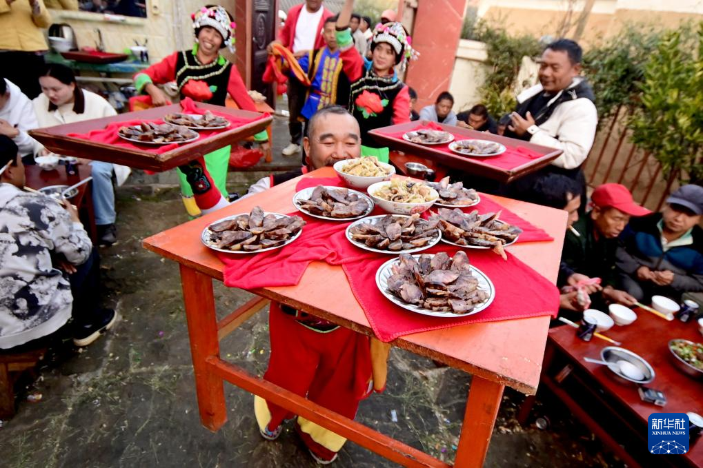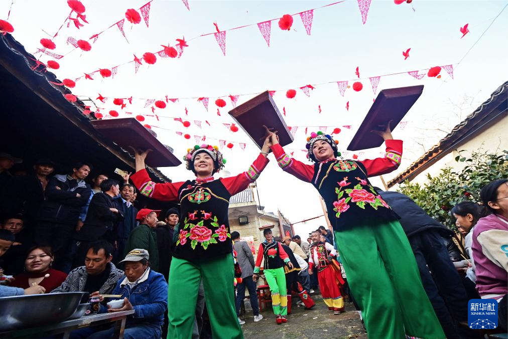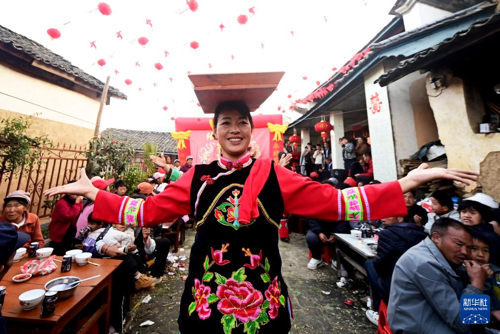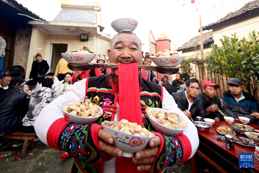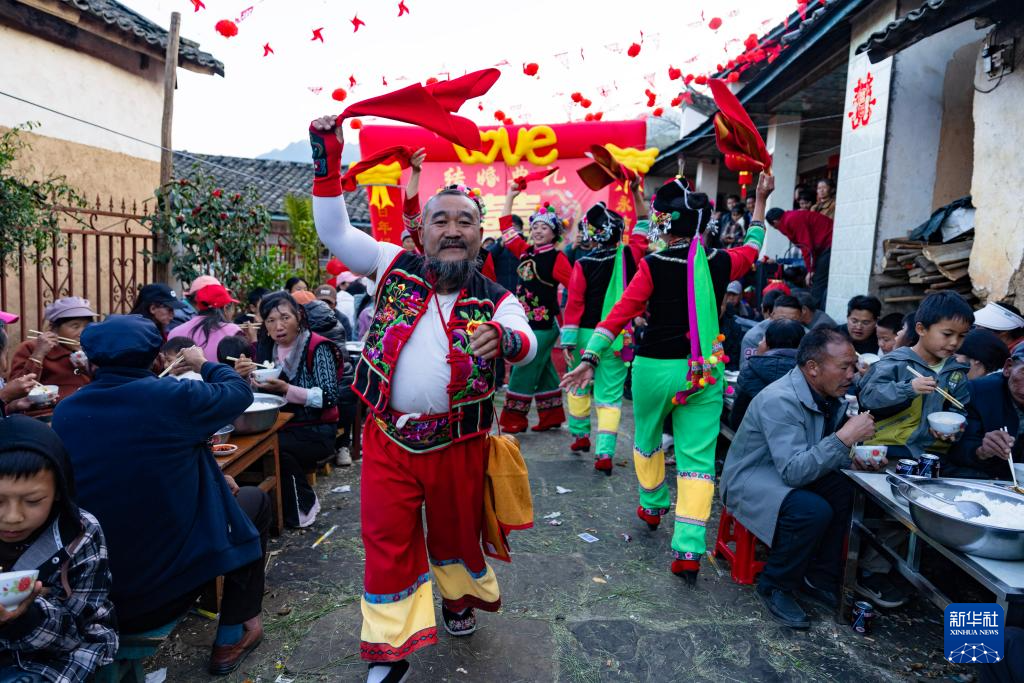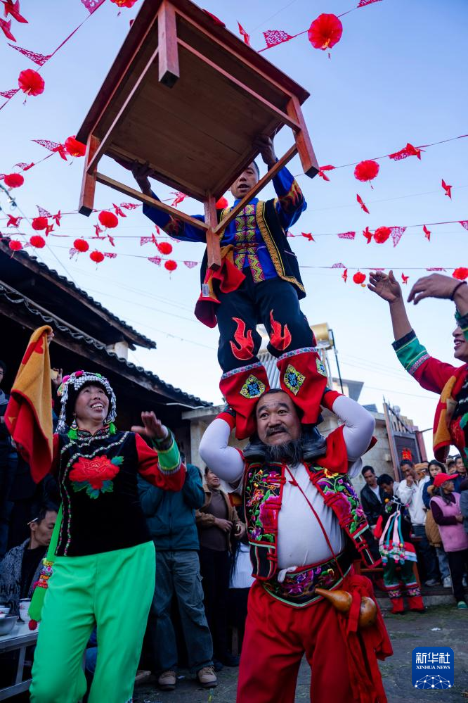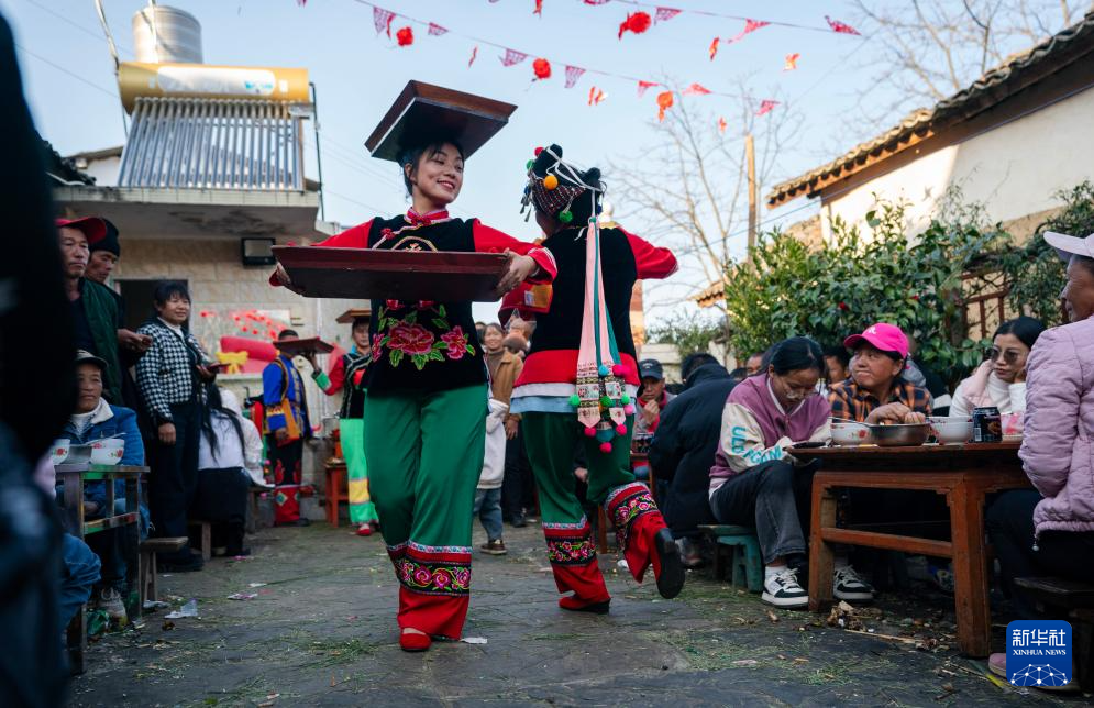 新春的云南省大理白族自治州南澗彝族自治縣熱鬧非凡。當地村民在火紅的燈籠下擺開宴席,隨著鑼鼓、嗩吶聲響起,跳菜表演者頭頂托盤、口咬桌角、三翻三轉……在樂聲中騰挪跳躍,將彝家美食送上餐桌。