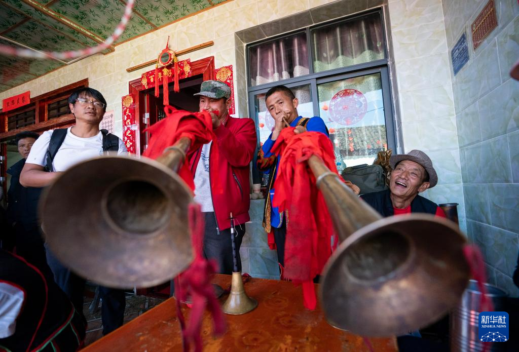 2月7日,樂手在南澗縣寶華鎮擁政村一農戶家的婚禮跳菜上吹奏樂器。