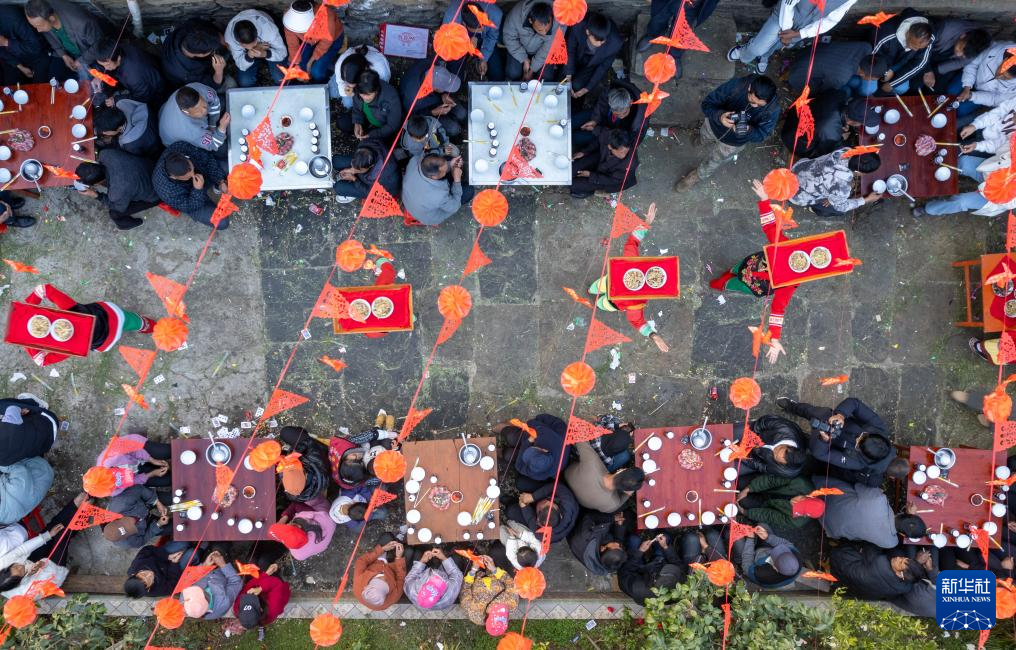 2月7日,跳菜表演者在南澗縣寶華鎮擁政村一農戶家的婚禮上表演(無人機照片)。