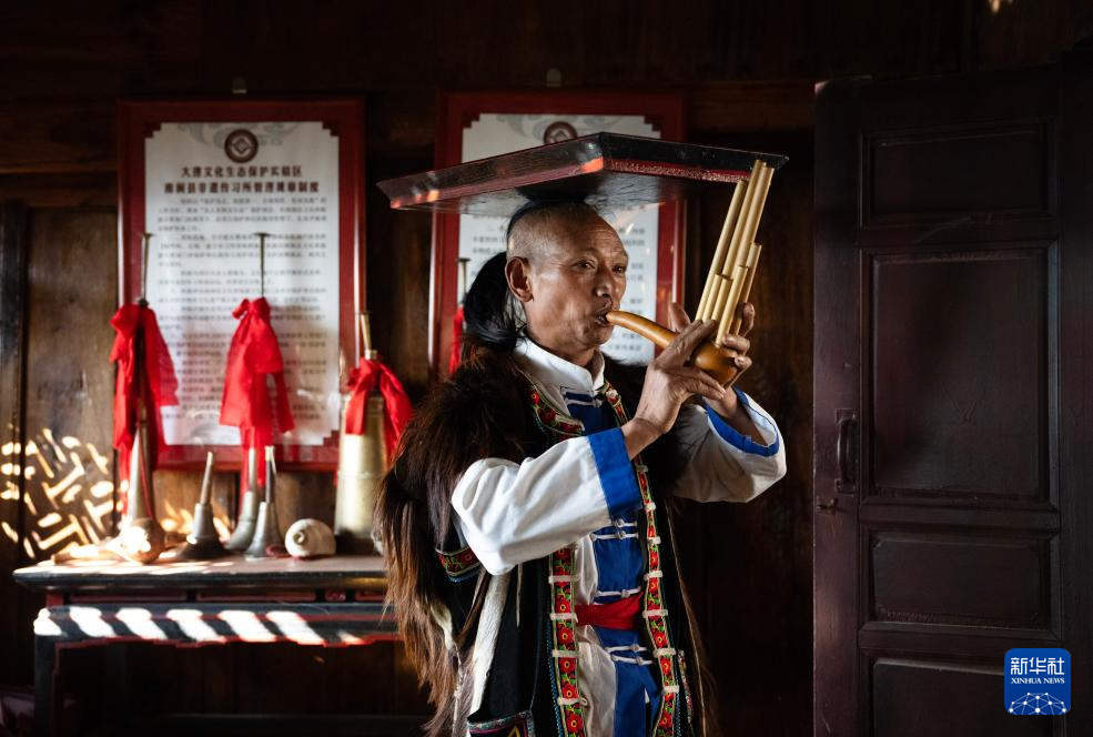 2月7日,南澗彝族跳菜國家級非物質文化遺產代表性傳承人魯朝金在非遺傳習所內演示跳菜技藝。