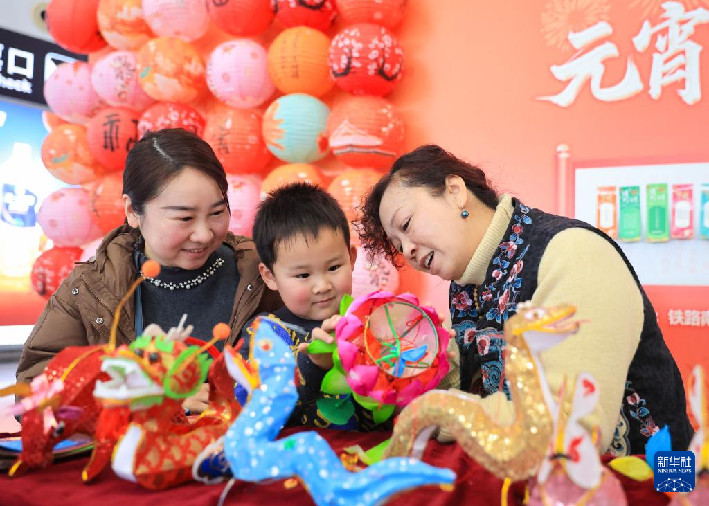 2月11日,旅客在南京南站舉辦的迎接元宵節活動上體驗制作花燈。