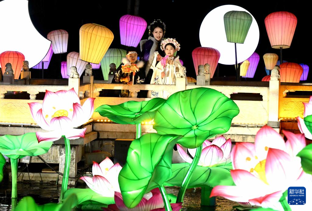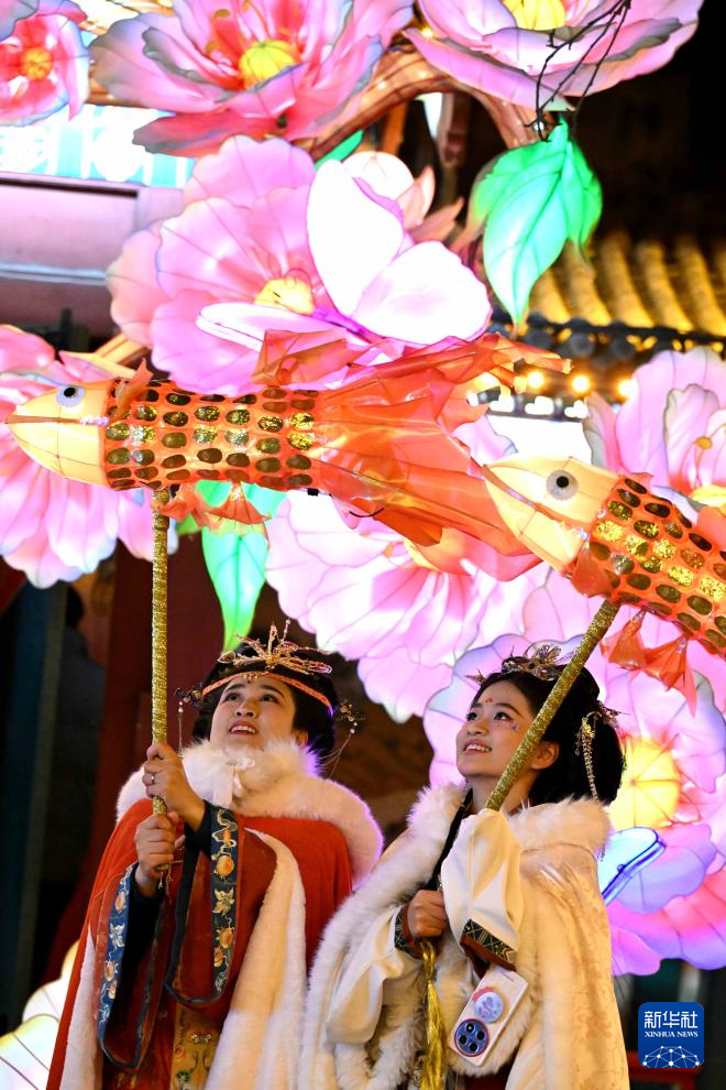 2月8日晚,身著傳統服飾的游人在河北省石家莊市正定榮國府影視基地內游園賞花燈。