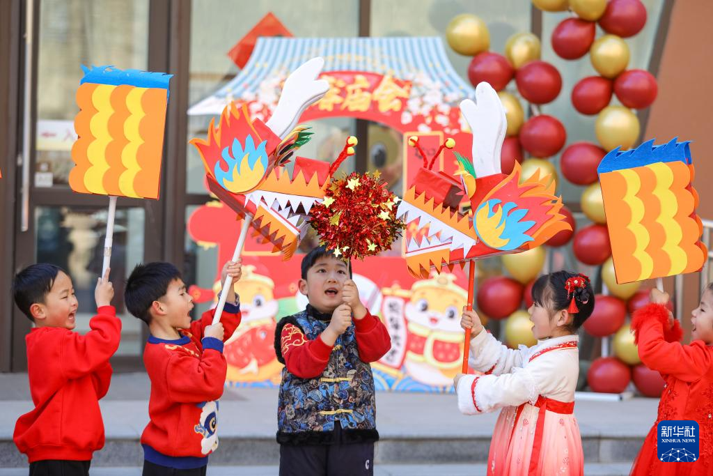 2月10日,小朋友在山東省青島市李滄區九水東路幼兒園開展的民俗活動中進行舞龍表演。