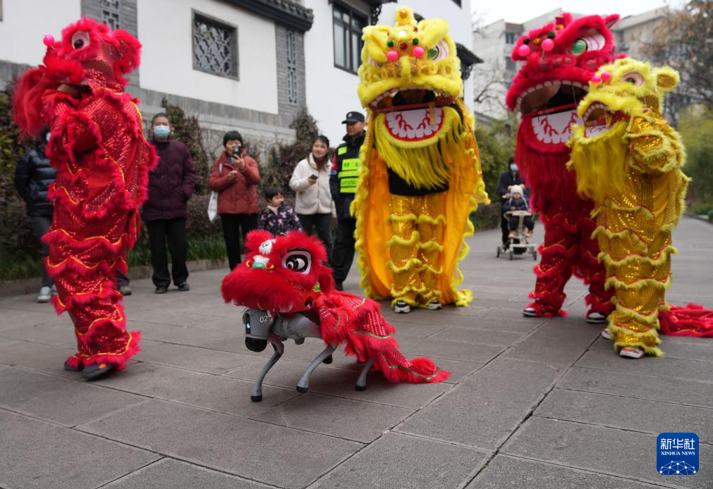 2月11日,在浙江杭州市西湖區北山街道元宵文化廟會活動中,機器狗與演員一起為社區居民進行舞獅表演。