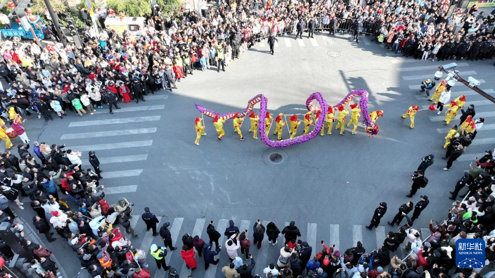 2月9日,舞龍隊在浙江省湖州市德清縣乾元鎮巡游展演(無人機照片)。