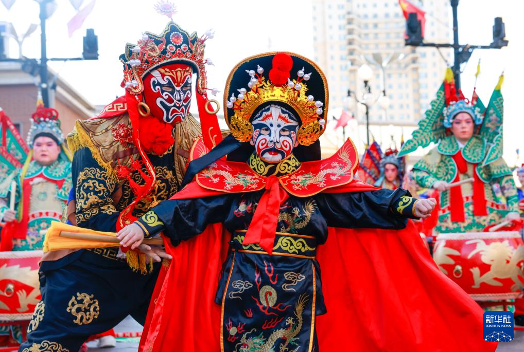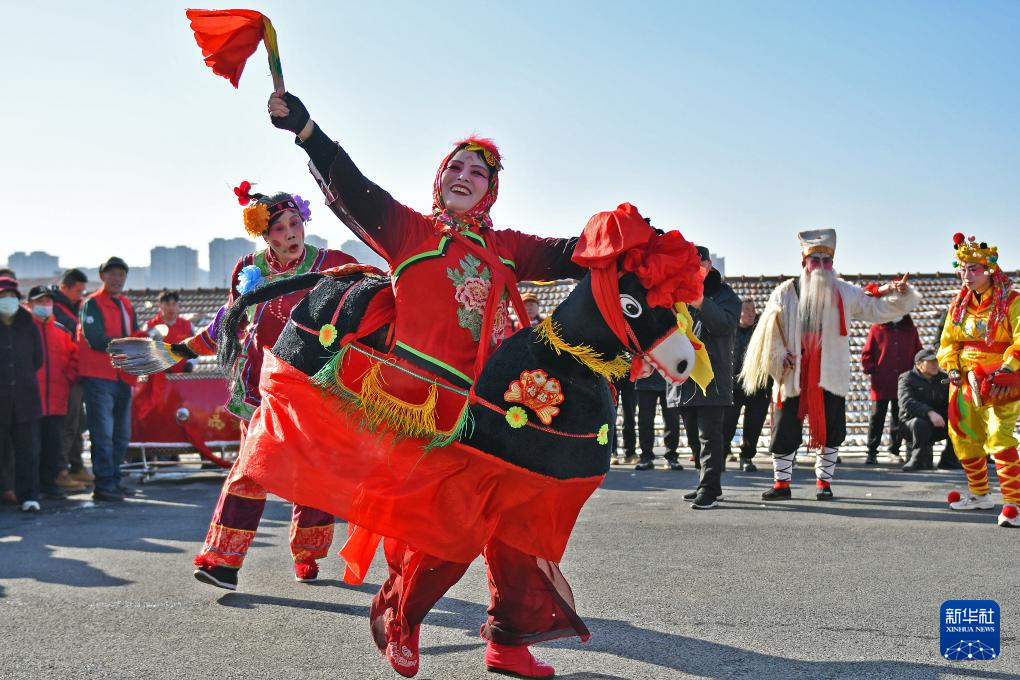 2月11日,民間藝人在河北省遵化市華明路街道表演民俗節目。