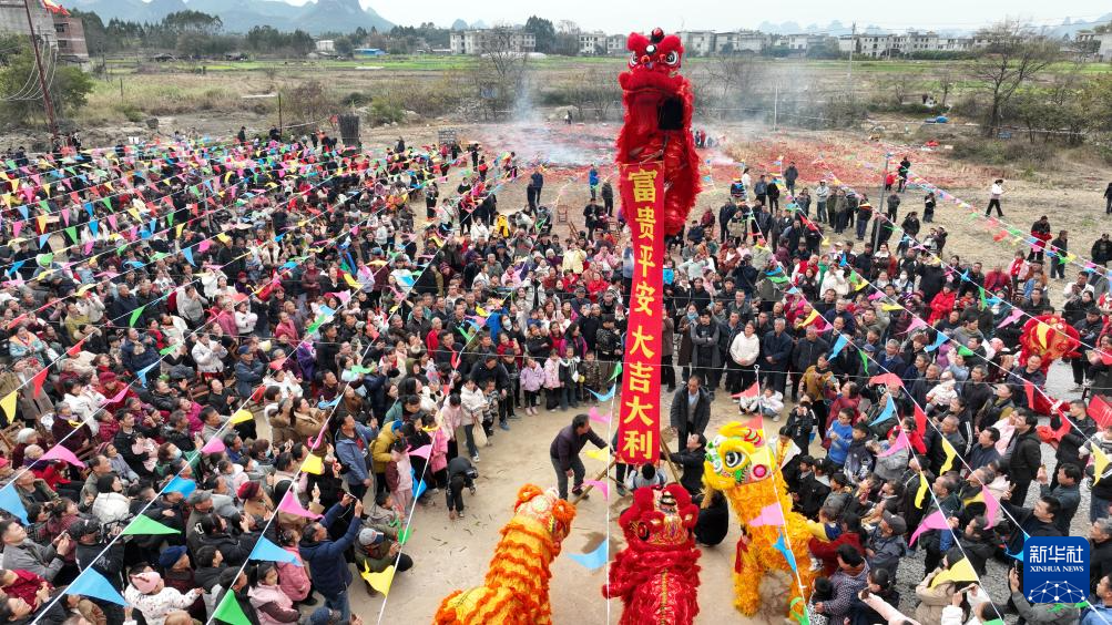 2月9日,廣西柳州市柳江區進德鎮四連村土垢屯,村民在客家“上燈節”活動上進行舞獅表演(無人機照片)。