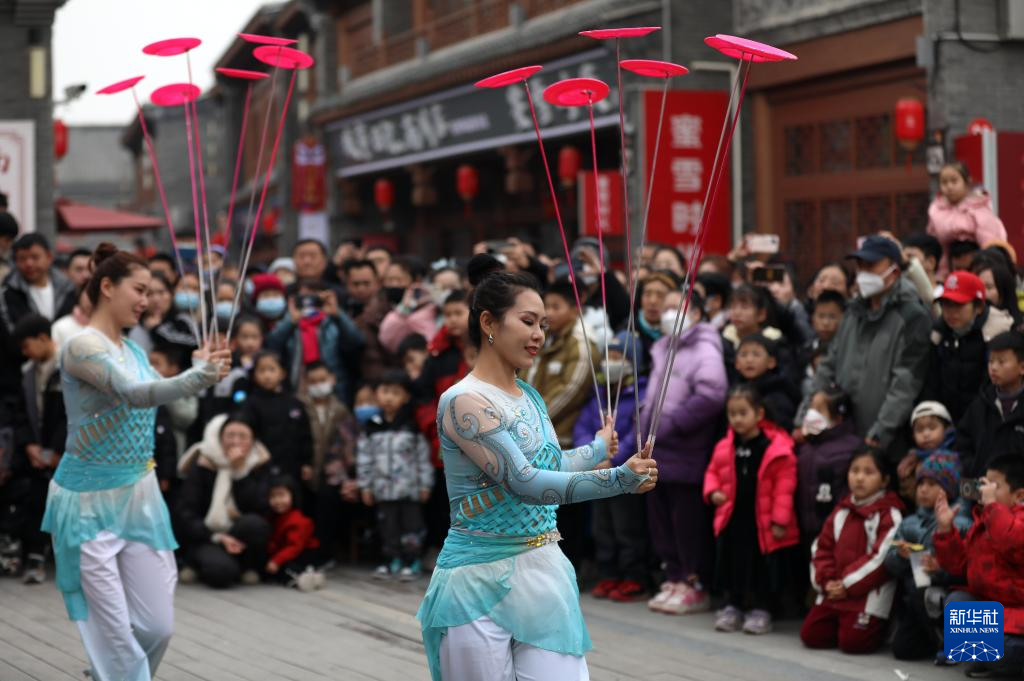 2月11日,在河北省滄州市運河區南川老街景區,民間藝人為游客表演雜技節目《轉花碟》。
