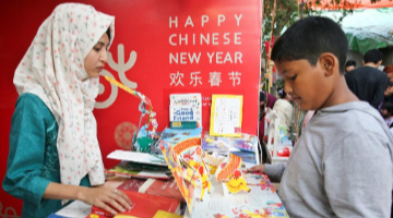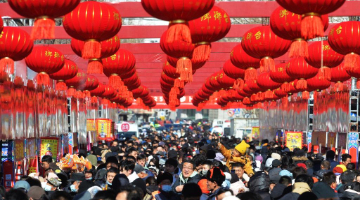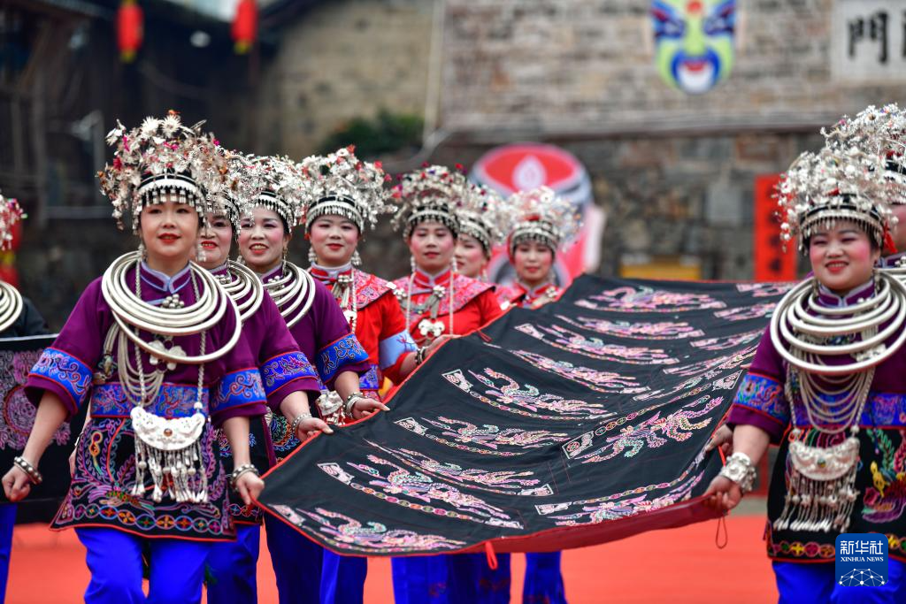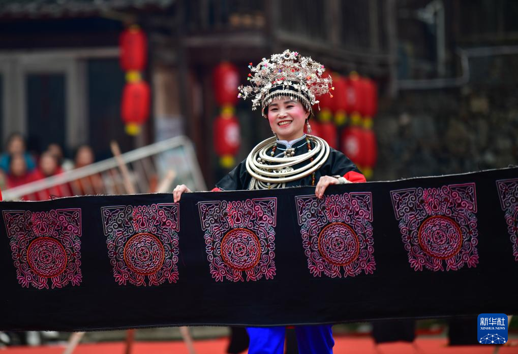 2月11日,少數民族同胞在貴州省錦屏縣隆里古城舉辦的“村晚”活動中展示民族刺繡。