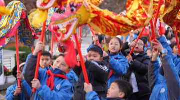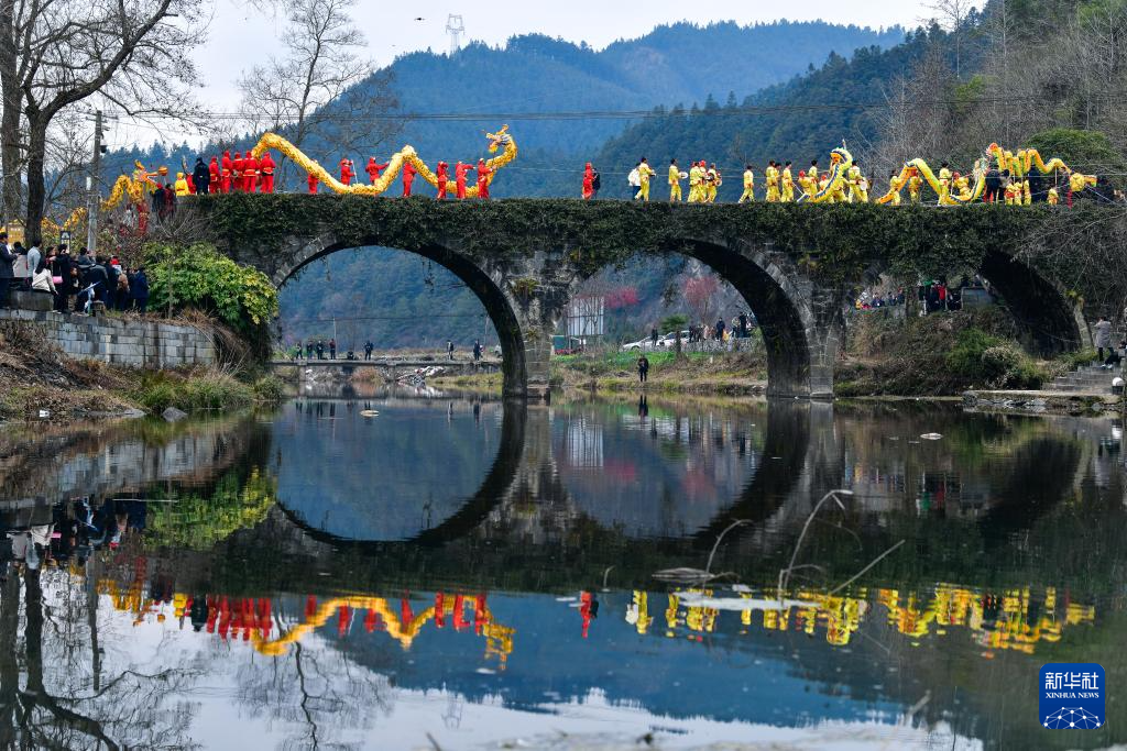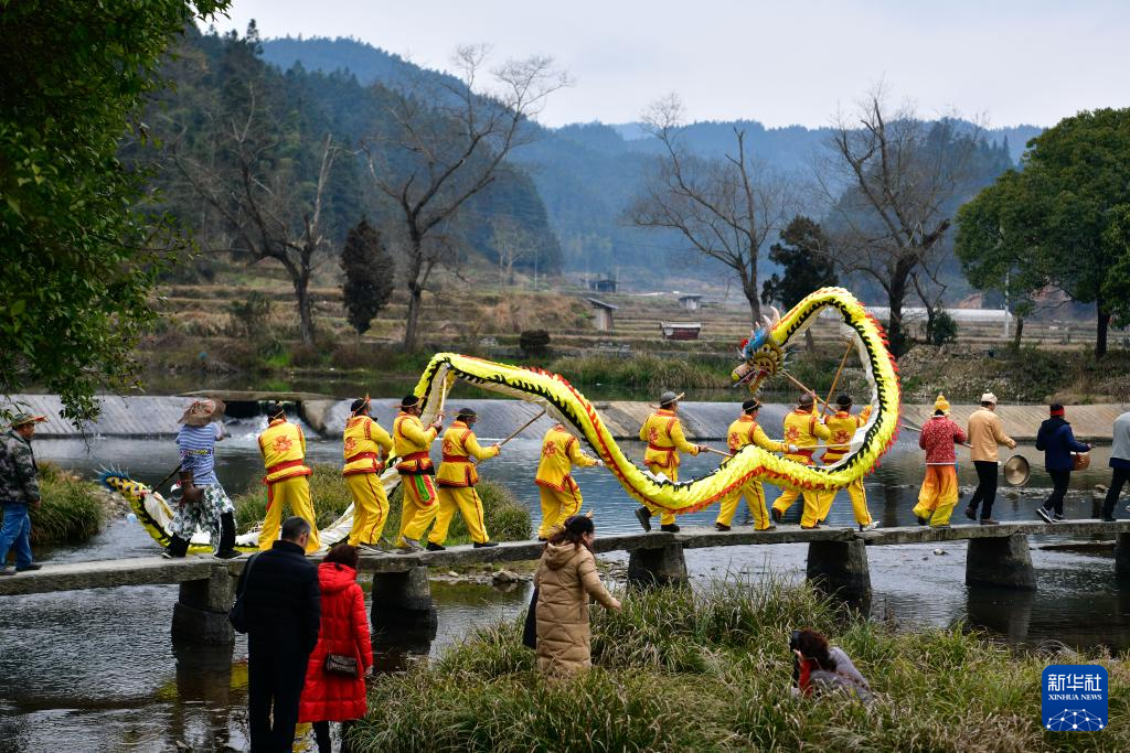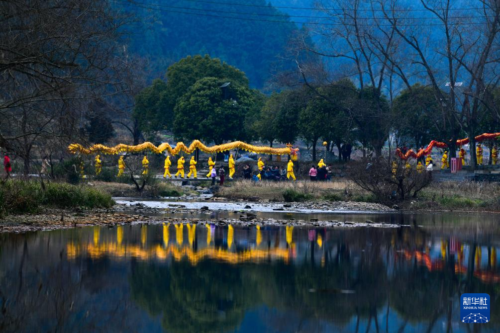 2月11日,人們在貴州省錦屏縣隆里古城舉辦的“村晚”巡游活動中舞龍。