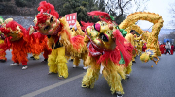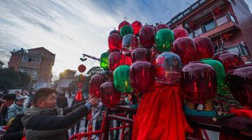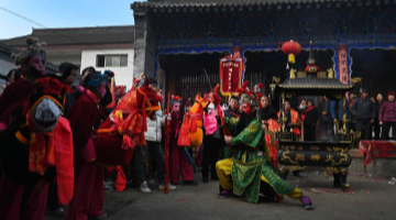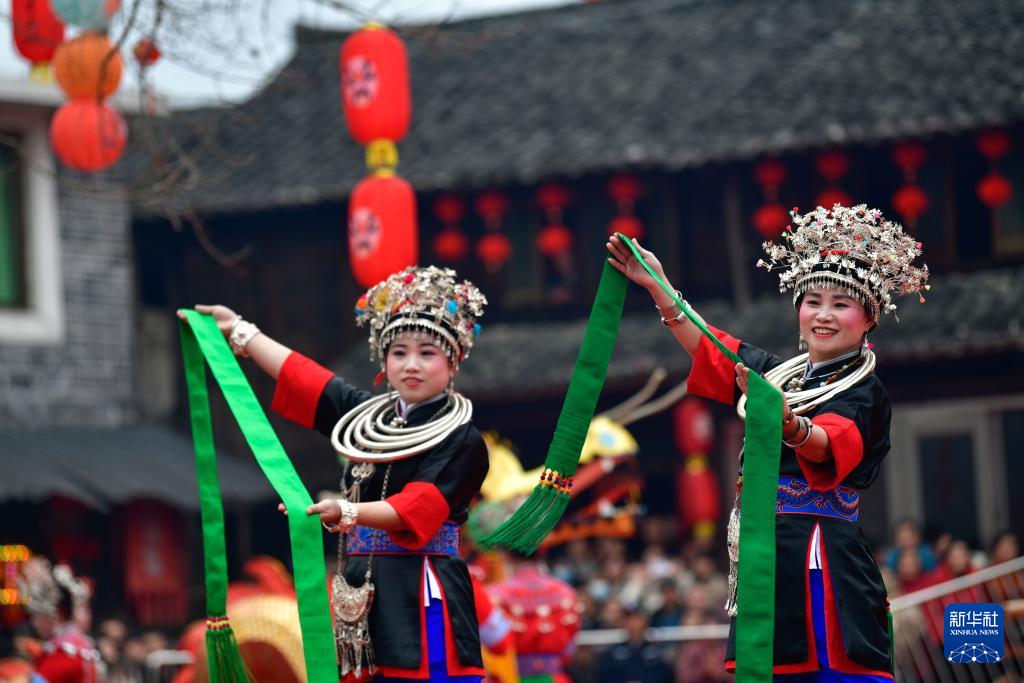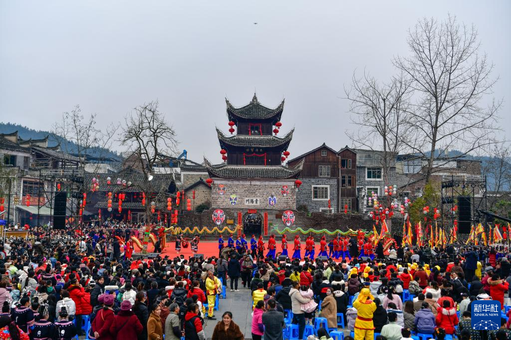 2月11日,表演隊在貴州省錦屏縣隆里古城參加“村晚”巡游活動。