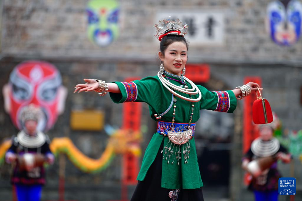 2月11日,演員在貴州省錦屏縣隆里古城舉辦的“村晚”活動中展示民族服飾。
