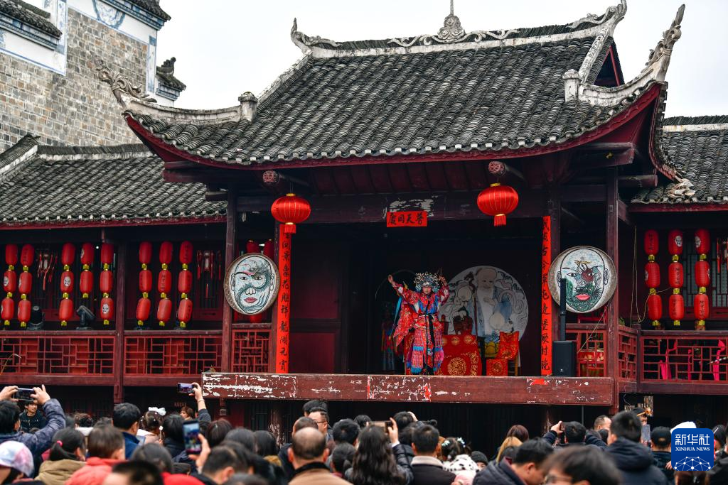 2月11日,人們在貴州省錦屏縣隆里古城觀看戲曲表演。