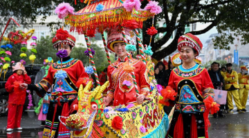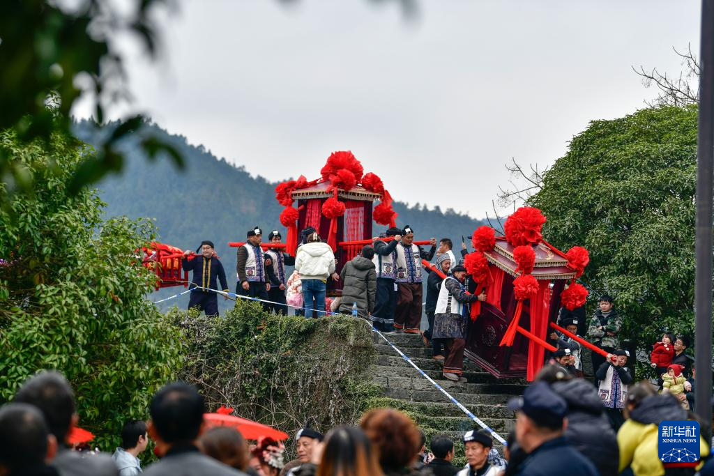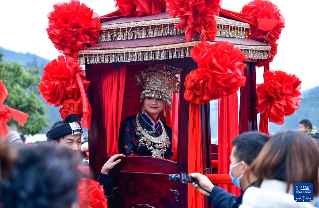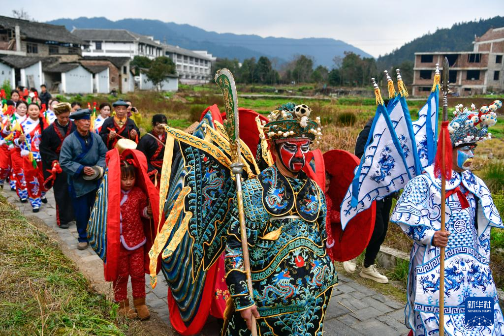 2月11日,迎親表演隊在貴州省錦屏縣隆里古城參加“村晚”巡游活動。