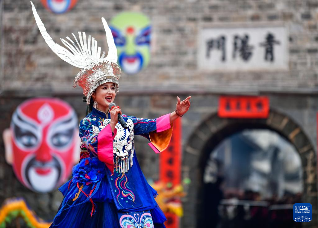 2月11日,苗族歌手在貴州省錦屏縣隆里古城舉辦的“村晚”活動中演唱歌曲。