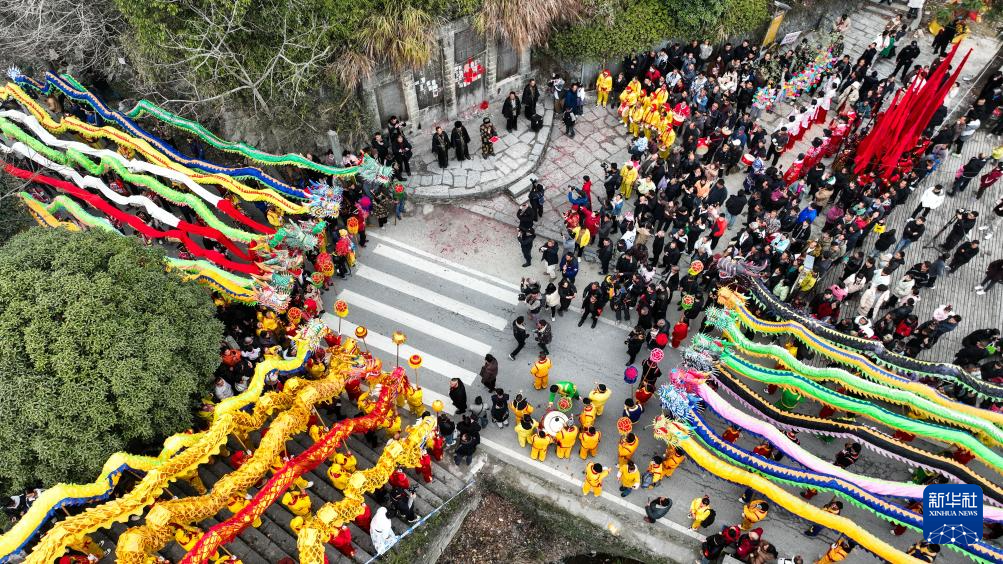 2月11日,人們在貴州省錦屏縣隆里古城舉辦的“村晚”巡游活動中舞龍(無人機照片)。