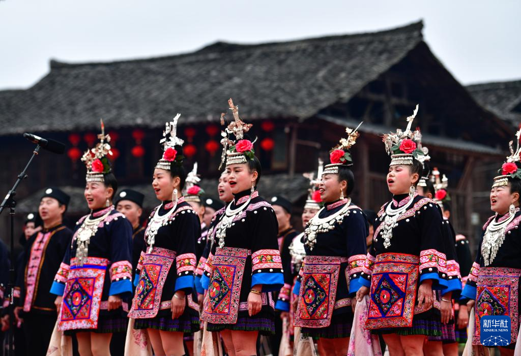 2月11日,少數民族同胞在貴州省錦屏縣隆里古城舉辦的“村晚”活動中演唱民族歌曲。
