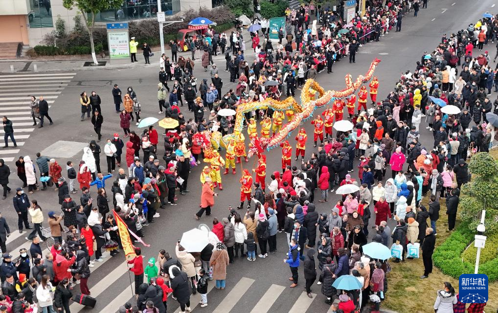 2月12日,龍舞隊在瀘縣街頭巡游(無人機照片)。