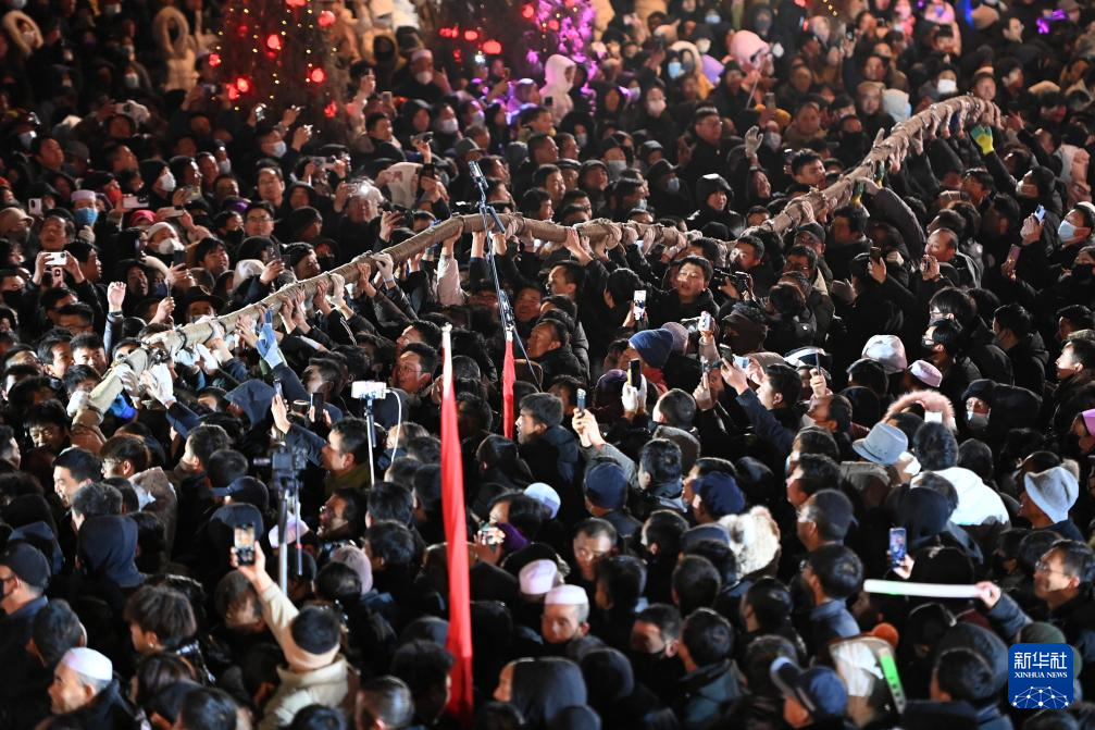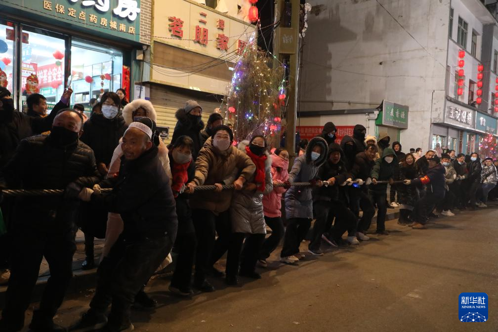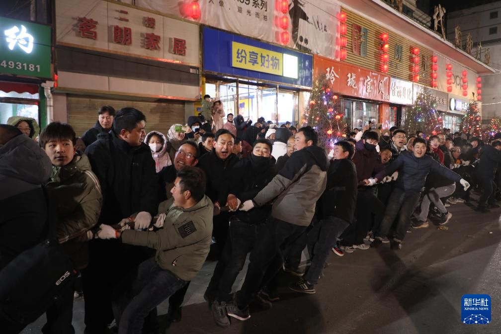 當晚,2025年元宵節“萬人扯繩”民俗活動在甘肅省甘南藏族自治州臨潭縣城關鎮西大街舉行,數萬名各族群眾在一根長度超過1800米的鋼繩兩側角力競技、吶喊加油。