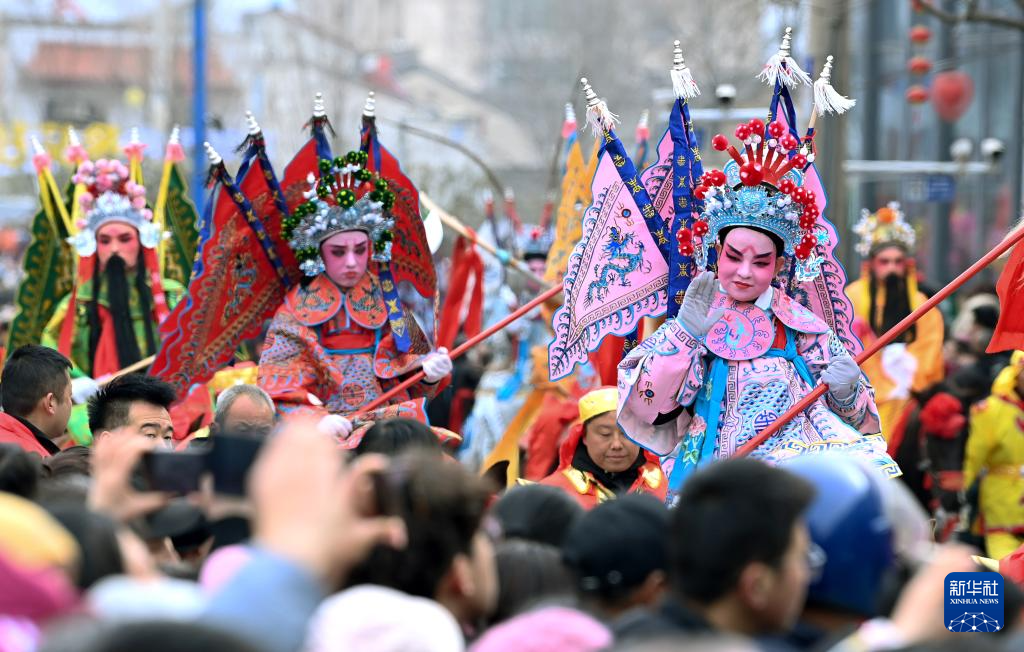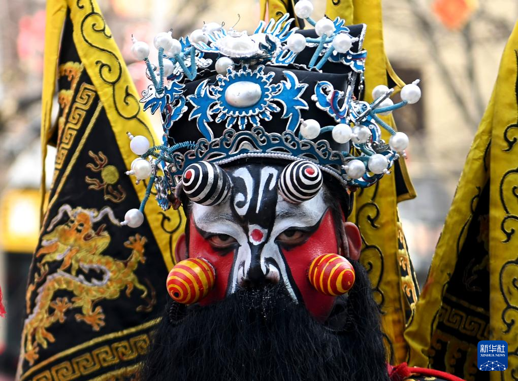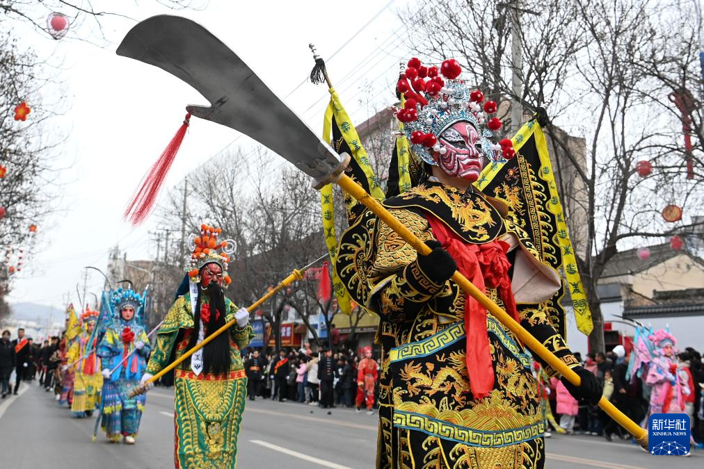 2月12日,步社火演員在隴縣元宵節社火巡游活動上表演。