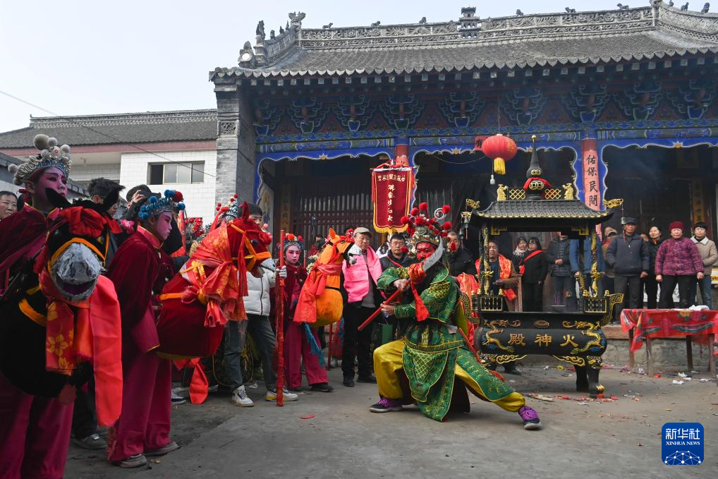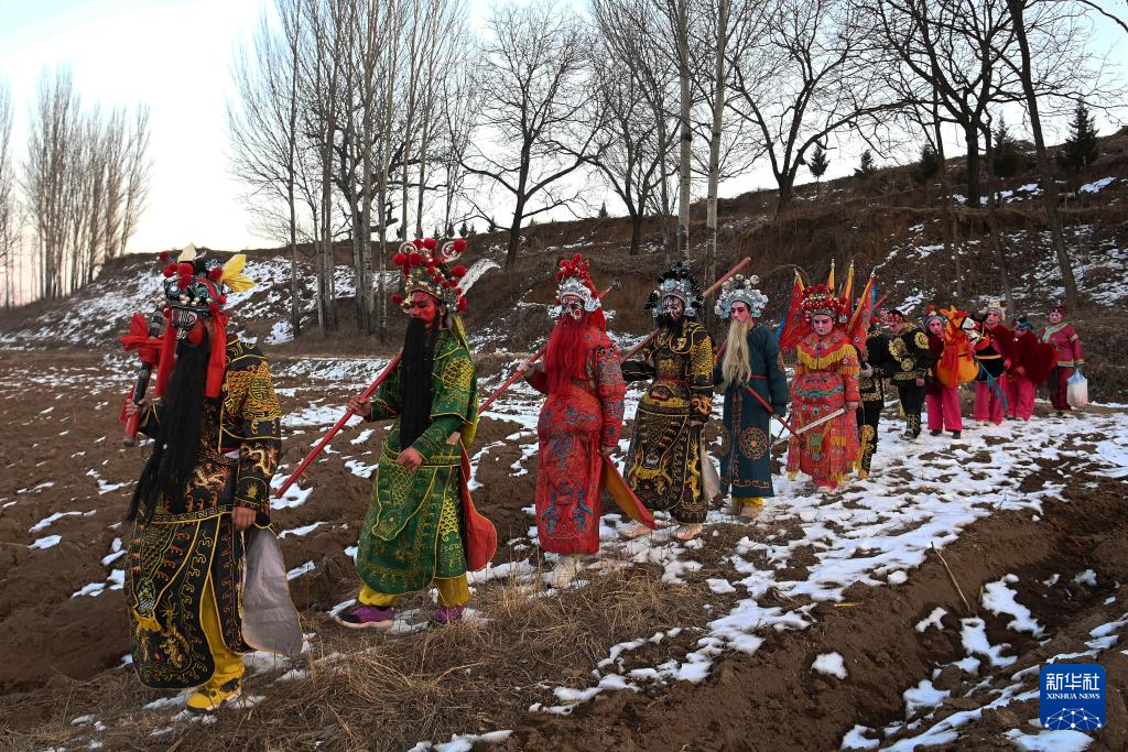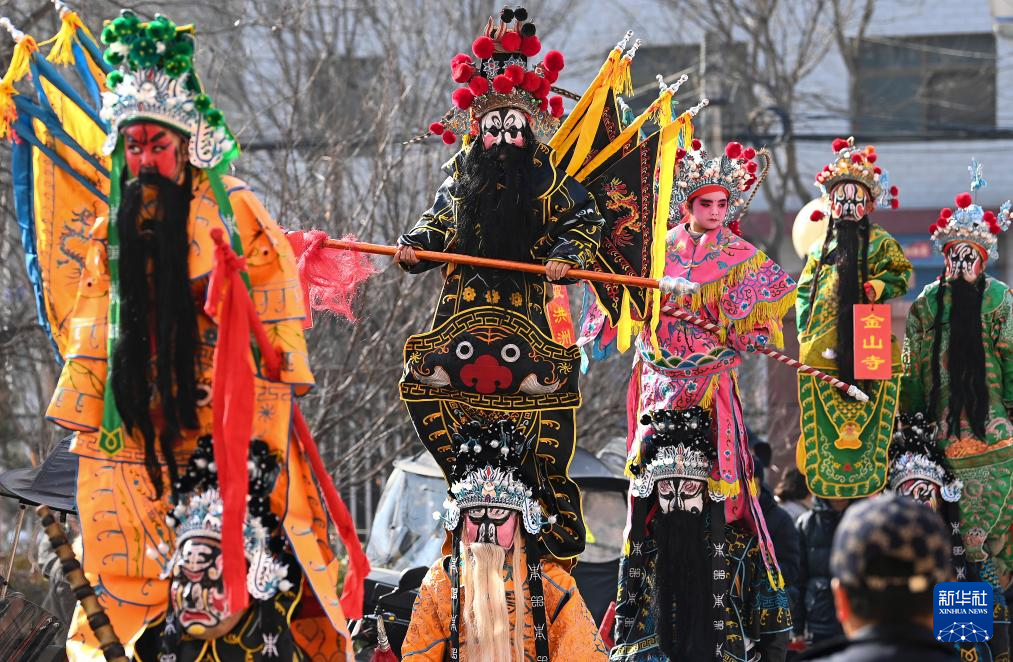 2月9日,隴縣流渠村的步社火隊在隴縣三里營村進行游演。