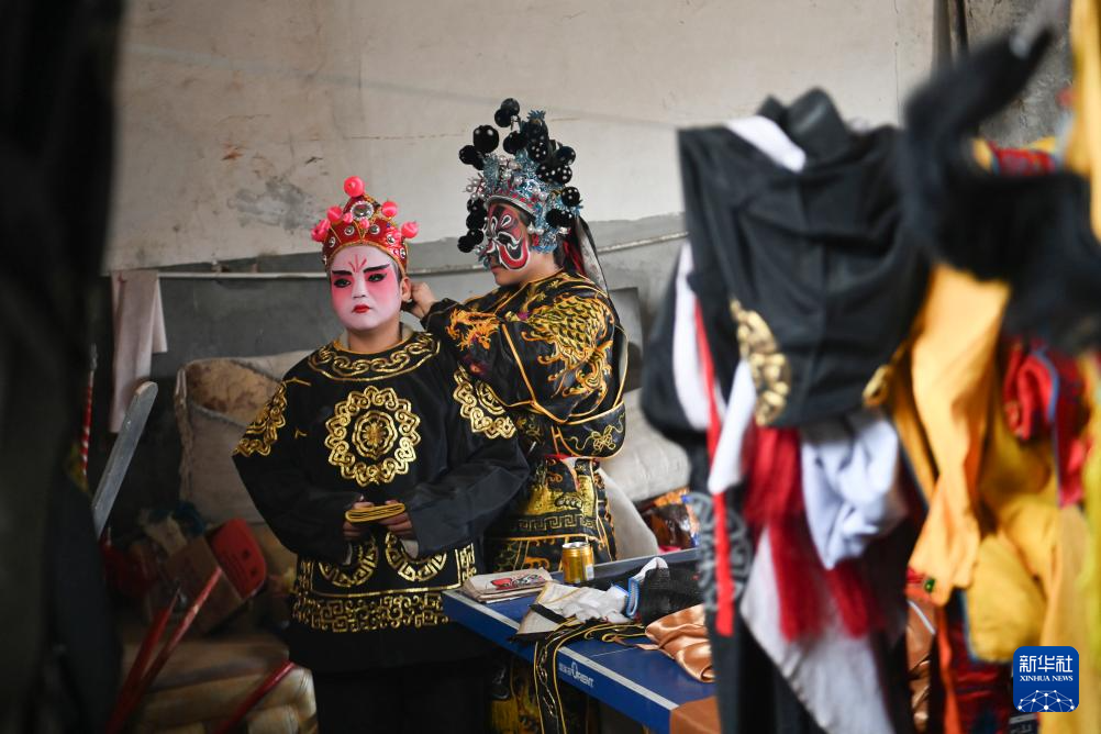 2月9日,隴縣流渠村社火隊的孩子為同伴整理演出服裝。