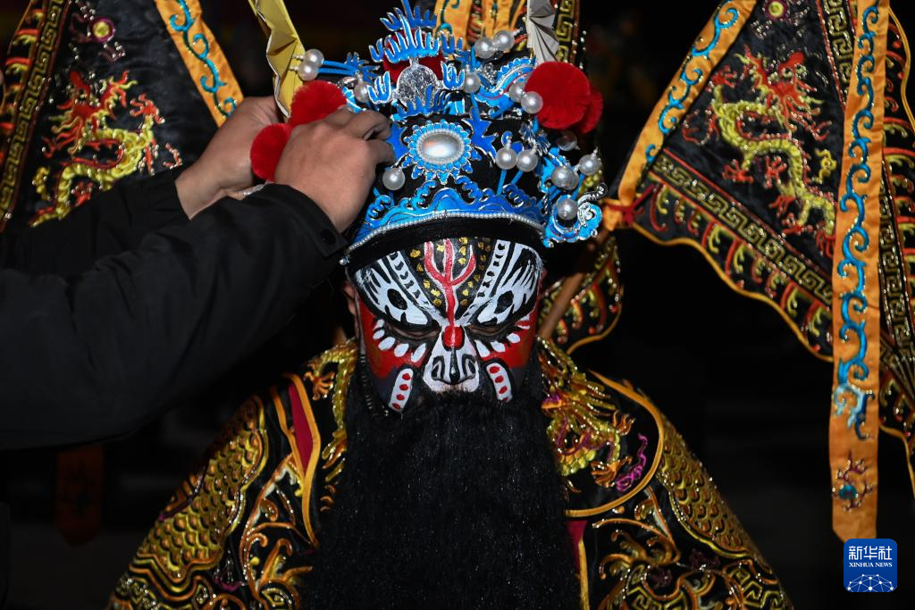2月11日,在隴縣黃花峪村,一名村民為馬社火演員穿戴演出服飾。