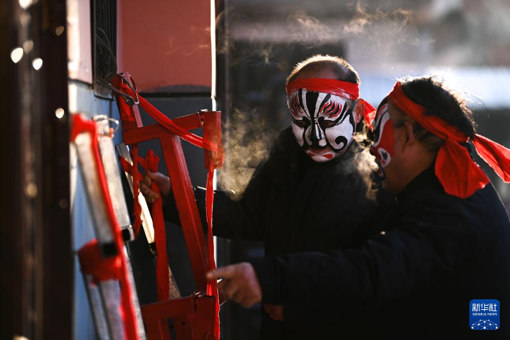 2月10日,隴縣北關村挈社火隊成員在挑選演出道具。