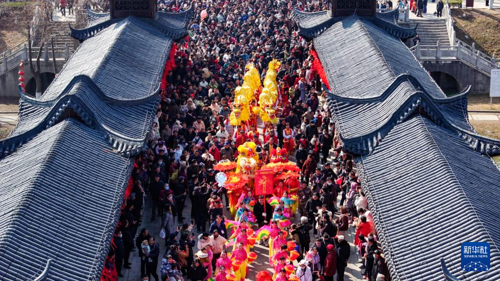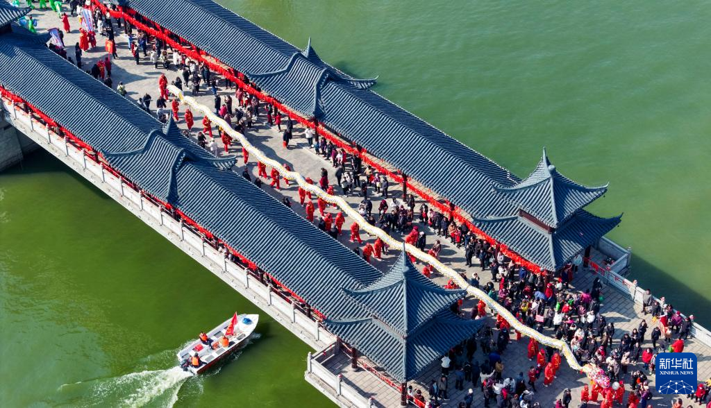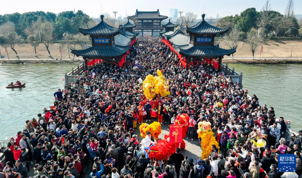 2月13日,民俗文藝表演隊從全椒縣太平橋上經過(無人機照片)。