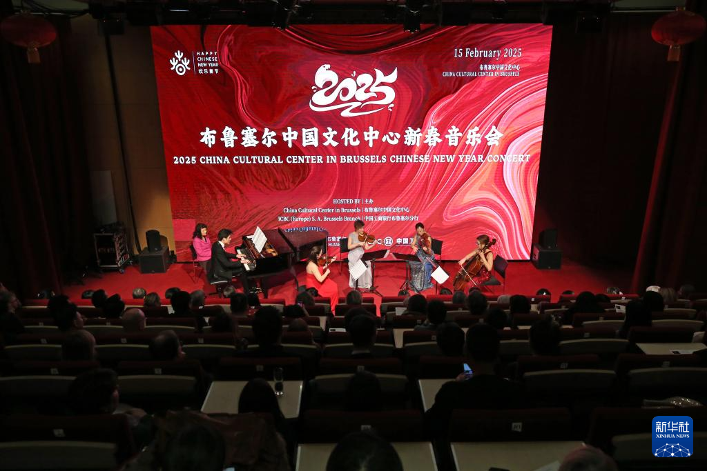 當日,比利時布魯塞爾中國文化中心舉行2025年新春音樂會。音樂會上,中外藝術家為觀眾獻上《春節序曲》《彩云追月》《第二圓舞曲》《父親的草原母親的河》等作品,展現了中西音樂的獨特魅力。