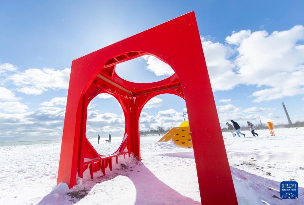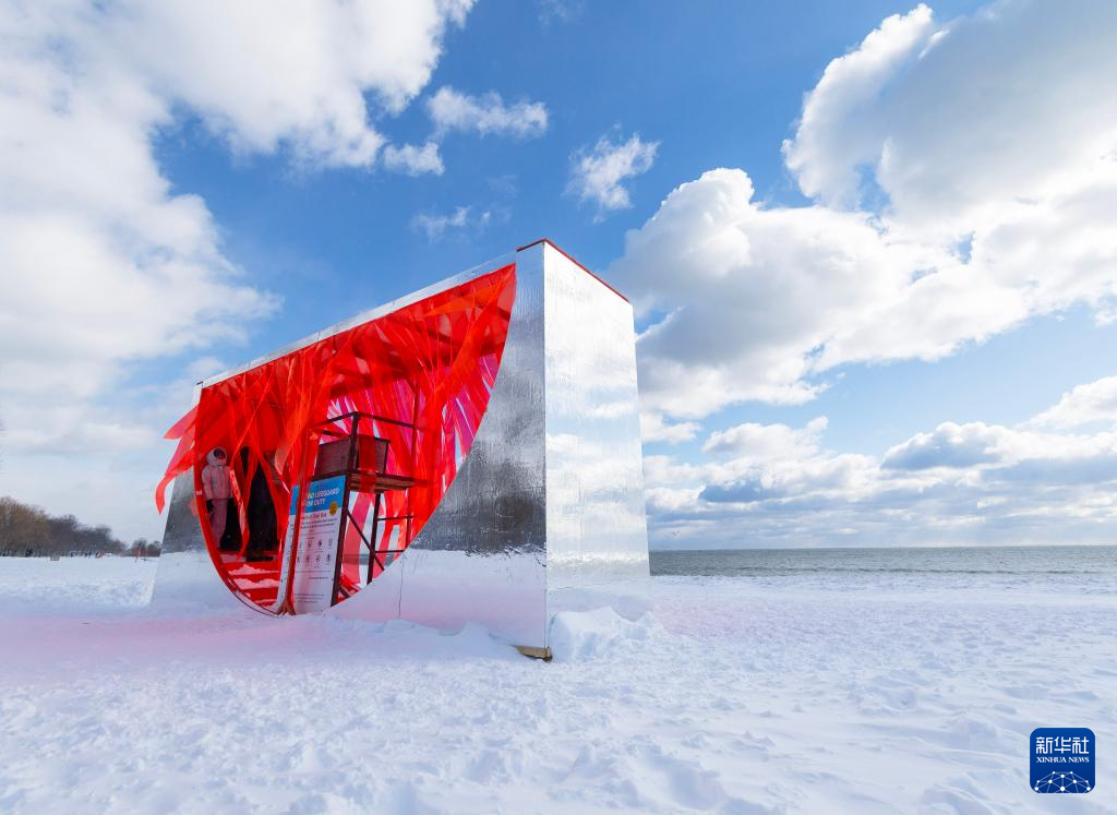當日,多倫多2025年“冬季小筑”國際設計比賽獲獎作品在安大略湖畔展出?!岸拘≈笔且豁椧运毒壬鷨T崗亭為基礎的年度國際設計比賽。