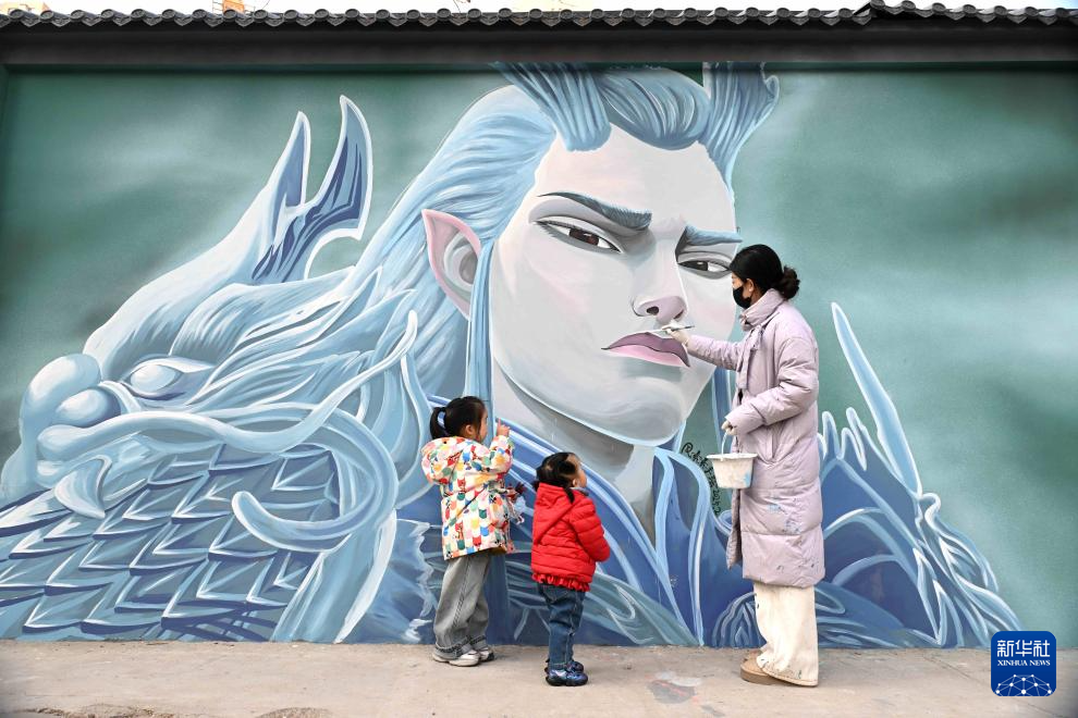 2月19日,畫師(右)在石家莊市裕華區富強大街與塔南路交口處創作哪吒主題墻繪。