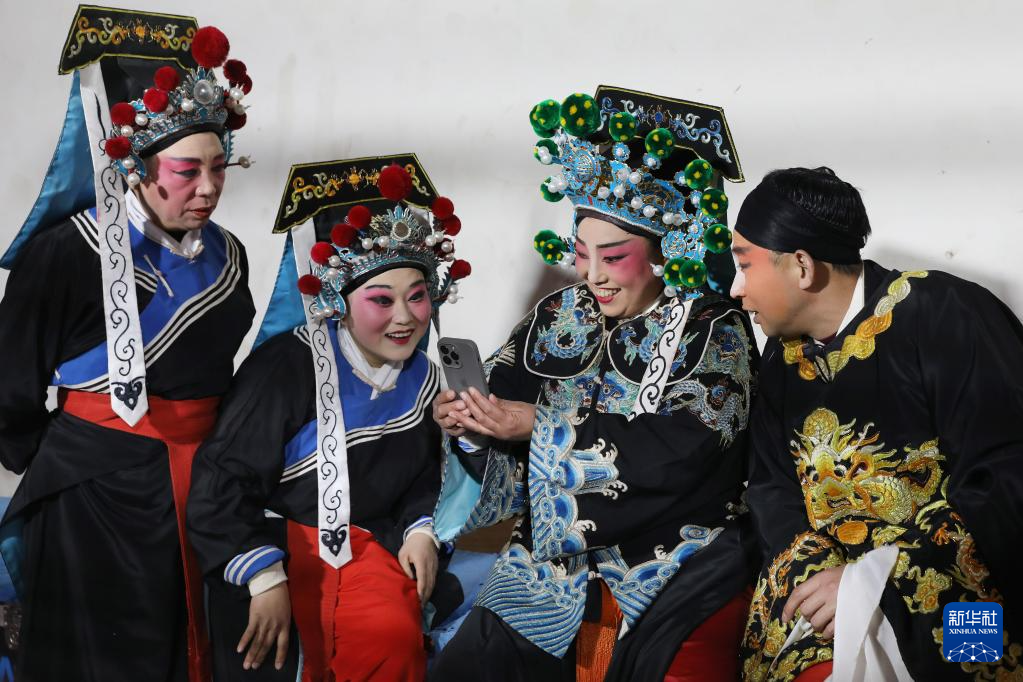 2月18日,演員在溫縣武德鎮村文化中心候場時欣賞劇照。
